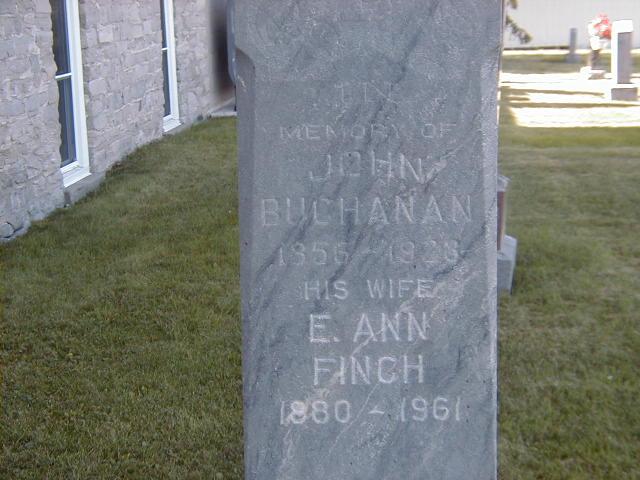 John Buchanan was born on 6 January 1856 at Seymour Twp., Northumberland Co., Ontario; Date 1856 per Memorial. Date Jan 6 - 46 & location Seymour Twp. per Death Reg'n. Date Jan 6 1857 & location Ont. rural per 1901 Census. Date 1857 & location Ont. per 1881 Census. Date 1856 & location UC per 1861 Census. Date 1857 & location Ont. per marr. reg'n. - Susam Mary Grills. Date 1858 & location Seymour Twp. per marr. reg'n. - Eliza Ann Finch.1,2,3,4,5,6 He appeared on the census of April 1861 at Seymour Twp., Northumberland Co., Ontario; Age 5 at 1861 Census: see John Buchanan.5 He lived on 10 June 1874 at Seymour Twp., Northumberland Co., Ontario; Witness at marriage of Samuel Buchanan and Jane Grills.1 He lived on 4 December 1878 at Seymour Twp., Northumberland Co., Ontario; Residence Seymour per marr. reg'n.1 He married Susan Mary Grills, daughter of Thomas Grills and Mary Grace Piper, on 4 December 1878 at Brighton, Northumberland Co., Ontario; Marriage Reg'n.#007498: Groom: John Buchanan; Age: 21; Res.: Seymour; Born: Ont; Status: bachelor; Occ.: farmer; Parents: John & Jane Buchanan; Bride: Susan Grills; Age: 20; Res.: Seymour; Born: Ont; Status: spinster; Parents: Thomas & Grace Grills; Wit.: Robert Graham & Rhoda Grills; Date: Dec 4 1878; Place: Brighton; Rel.: Pres. & Bible Chr; Performed by: Kennedy Creighton; Reg'r.: M. K. Lockwood (Ontario Marriage Registration, #007498-1878, ancestry.com.)7 John Buchanan appeared on the census of April 1881 at Seymour Twp., Northumberland Co., Ontario; Age 24 at 1881 Census: Buchanan, John, 24, b. Ont., Scot., c. Pres., farmer, married; Susan, 22, b. Ont., married (familysearch.org.)2 He appeared on the census of 19 April 1901 at Seymour Twp., East Northumberland Co., Ontario; Age 44 at 1901 Census: Buchanan, John, 44, b. Ont. r. Jan 6 1857, Scot., Meth., farmer, married; Mary S., 43, b. Ont. r. July 18 1857, Eng., Meth., married; Minnie V. B., 4, b. Ont. r. Feb 18 1897, Scot., Meth., dau. (1901 Census: Seymour Twp., East Northumberland Co., dist. 95, sub-dist. J-3, pg. 9, line 46 - ancestry.ca.)6 He lived on 2 December 1904 at Seymour Twp., Northumberland Co., Ontario; Residence Seymour Twp. per marr. reg'n.1 He married Elizabeth Ann Finch, daughter of James Finch and Catherine Fry, on 2 December 1904 at Seymour Twp., Northumberland Co., Ontario; Marriage Reg'n.#013479: Groom: John Buchanan; Age: 46, Res. & Born: Seymour Twp; Status; widowed; Occ.: farmer; Parents: John Buchanan & Jane Hay; Bride: Eliza Ann Finch; Age: 26; Res.: Seymour Twp; Born: Rawdon Twp; Status: spinster; Parents: James Finch & Catherine Fry?; Wit.: Minnie S. & Ethel May Fusee, Campbellford; Date: Dec 2 1904; Place: Campbellford; Rel.: Meth; Performed by: Rev. C. H. Fusee; Reg'd.: Dec 3? 1904; Reg'r.: E. M. West, Seymour Twp. (Ontario Marriage Registration, #013479-1905, ancestry.ca) per Memorial.4,8 John Buchanan died on 1 May 1928 at Seymour Twp., Northumberland Co., Ontario, at age 72; Death Reg'n.#025601: Name: John Buchanan; Date: May 1 1928; Age: 72y 3m; Born: Seymour Twp., Jan 6 - 46; Res. at place of Death: 37y; Status: married; Occ.: farmer; Parents: John Buchanan & Jane Hay, b. Scotland; Phys.: Dr. Loucks, Campbellford; Inf.: Mrs. John Buchanan, Campbellford, wife; Burial: English Line Cemetery, Mary 3 1928; Und.: A. D. Bennett, Campbellford; Reg'd.: May 2 1928; Reg.: G. A. Hay (Ontario Death Registration, #025601-1928, ancestry.com) Date 1929 per IGI Record.9,10 He was buried on 3 May 1928 at English Line Cemetery, Seymour Twp., Northumberland Co., Ontario; Memorial: (See Exhibit) In; Memory of; John; Buchanan; 1856 - 1928; His Wife; E. Ann; Finch; 1880 - 1961 (English Line Cemetery, Seymour Twp., Aug 11 2006)