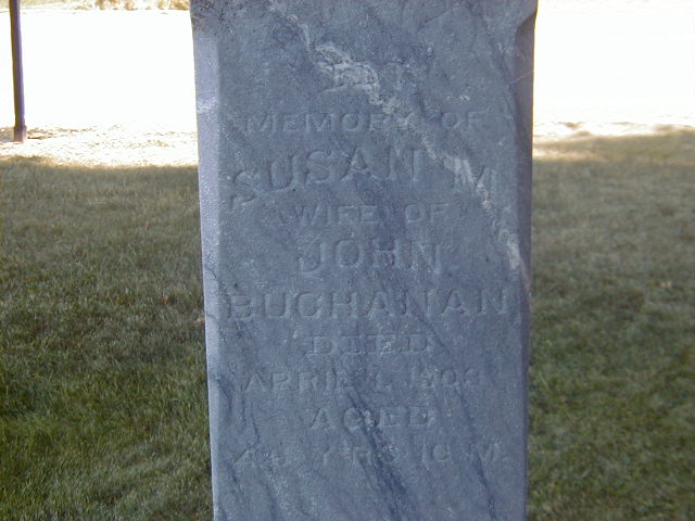 Susan Mary Grills was born on 18 July 1857 at Canada West; Date July 18 1857 & location Ont. rural per 1901 Census. Date 1859 & location Ont. per 1881 Census. Date 1858 & location Ont. per marr. reg'n.1,6,4 She lived on 10 June 1874 at Seymour Twp., Northumberland Co., Ontario; Witness at marriage of Samuel Buchanan and Jane Grills.1 She lived on 4 December 1878 at Seymour Twp., Northumberland Co., Ontario; Residence Seymour per marr. reg'n.1 As of 4 December 1878,her married name was Buchanan.1 She married John Buchanan, son of John Barthey Buchanan and Jane Hay, on 4 December 1878 at Brighton, Northumberland Co., Ontario; Marriage Reg'n.#007498: Groom: John Buchanan; Age: 21; Res.: Seymour; Born: Ont; Status: bachelor; Occ.: farmer; Parents: John & Jane Buchanan; Bride: Susan Grills; Age: 20; Res.: Seymour; Born: Ont; Status: spinster; Parents: Thomas & Grace Grills; Wit.: Robert Graham & Rhoda Grills; Date: Dec 4 1878; Place: Brighton; Rel.: Pres. & Bible Chr; Performed by: Kennedy Creighton; Reg'r.: M. K. Lockwood (Ontario Marriage Registration, #007498-1878, ancestry.com.)7 Susan Mary Grills appeared on the census of 19 April 1901 at Seymour Twp., East Northumberland Co., Ontario; Age 43 at 1901 Census: see John Buchanan.4 She died on 7 April 1908 at Seymour Twp., Northumberland Co., Ontario, at age 50; Date Apr 7 1908 per Memorial.2 She was buried on 9 April 1908 at English Line Cemetery, Seymour Twp., Northumberland Co., Ontario; Memorial: (See Exhibit) In; Memory of; Susan M; Wife of; John; Buchanan; Died; April 7, 1908; Aged; 46 yrs 10 M (English Line Cemetery, Aug 11, 2006.)2