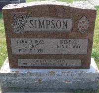 As an expression of sympathy, donations to the Parkinson Society Canada, Trinity St. Andrew’s United Church, or to a charity of your choice, would be appreciated by the family." per http://www.canadianobituaries.com/irene-gerrand-renie-simpson-obituary-may-5-2014.html. She was buried on 12 May 2014 at Brighton, Northumberland Co., Ontario; Memorial: (see Exhibit) SIMPSON; Gerald Ross; "Gerry"; 1925 - 1999; Irene G; "Renie" Way; - - ; Parents of Barb, Connie & Ian (Woods Cemetery, Cramahe Twp., image from FindaGrave, Sep 30 2024) Per obit.4