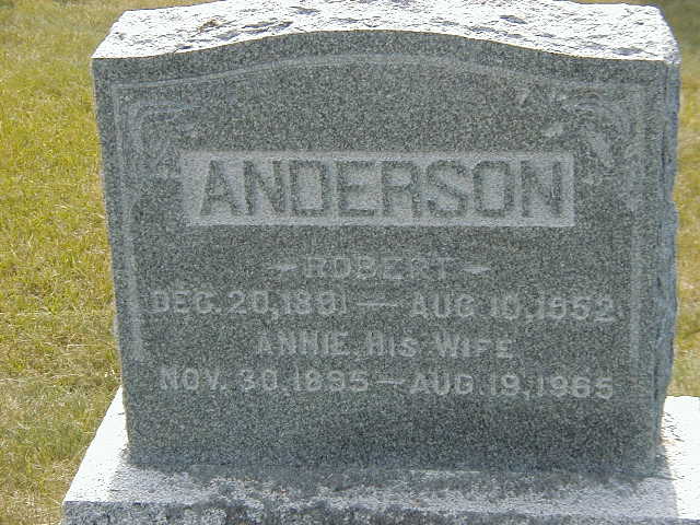 Robert Wesley Anderson was born on 20 December 1891 at Seymour Twp., Northumberland Co., Ontario; Birth Reg'n.#021728: Name: Robert Wesley Anderson; Date: Dec 20 1891; Parents: Timothy Anderson & Catherine Sager; Inf.: T. Anderson, farmer, Seymour; Reg'd.: Jan 18 1892; Phys.: Dr. Loucks; Reg'r.: W. Morton (Ontraio Birth Registration, #021728-1892, ancestry.com) Date 1891 & location Seymour Twp. per marr. reg'n. Date Dec 1892 & location Ont. per 1911 Census. Date Dec 20 1891 & location Ont. rural per 1901 Census.1,3,4,5 He appeared on the census of April 1901 at Brighton Twp., Codrington, Northumberland Co., Ontario; Age 10 at 1901 Census: see Timothy Anderson.1 He appeared on the census of 1911 at Brighton Twp., Codrington, Northumberland Co., Ontario; Age 19 at 1911 Census: see Timothy Anderson.5 He Border Crossing Card: Name: Robert Anderson; Date: 11/9/13; Age: 21; Born: Seymour Twp; Occ.: ?? ; Last Res.: Brighton Twp; Parents: father Timothy Anderson; Sponsor: ?Anna Herrington? (ancestry.com) on 11 September 1913 at New York, U.S.A.. He "Robert Anderson, brother-in-law of James Wright. They were in the same outfit overseas. He died in 1952." from The Tweedsmuir Histories of Codrington, copied from microfilm at The Metro Toronto Reference Library, Nov. 2007. circa 1916 at France.6 He lived on 17 December 1919 at Brighton Twp., Northumberland Co., Ontario; Residence Brighton Twp. per marr. reg'n.4 He married Annie Amelia "Millie" Wright, daughter of William James Wright and Emma Jane Reynolds, on 17 December 1919 at Brighton Twp., Northumberland Co., Ontario; Marriage Reg'n.#018384: Groom: Robert Wesley Anderson; Age: 27; Res.: Brighton Twp; Born: Seymour Twp; Status: bachelor; Occ.: farmer; Rel.: Meth; Parents: Timothy Anderson & Catherine Sager; Bride: Annie Millie Wright; Age: 24; Res. & Born: Brighton Twp; Status: spinster; Rel.: Meth; Parents: Wm. Jas. Wright & Emma Reynolds; Expected Res.: Brighton Twp; Wit.: James Arthur Wright & Lillie Hazelwood, Orland; Date: Dec 17 1919; Place: Brighton Twp; Performed by: W. S. Smart, Hilton, Meth; Sworn: Brighton, Dec 13 1919; Reg'r.: W. W. Porte (Ontario Marriage Registration, #018384-1919, ancestry.com) per Death Notice of Donald James Anderson.6,7 Robert Wesley Anderson Border Crossing Card: Name: Robert Wesley Anderson; Age: 34: Born: Dec 20 1891, Seymour Twp; Accompanied by: Wife & 2 children, Donald & ?Jean?; Mother: Catherine, Campbellford; Destination: Mrs. Grisseer, 201 Clifford Ave., Rochester (ancestry.com) on 4 December 1925 at Rochester, New York, U.S.A.. He Robert Anderson appears in The Latimer Photos, taken by Hugh Latimer at his father's General Store in Orland, c. 1930. (Latimer Photos, Codrington Public Library) circa 1930 at Brighton Twp., Northumberland Co., Ontario.8 He died on 10 August 1952 at Ontario at age 60; Date Aug 10 1952 per Memorial.9 He was buried on 13 August 1952 at McPhail's Cemetery, Brighton Twp., Northumberland Co., Ontario; Memorial: (See Exhibit) ANDERSON; Robert; Dec 20, 1891 - Aug. 10, 1952; Annie, His Wife; Nov. 30, 1895 - Aug. 19, 1965 (McPhail's Cemetery, Brighton Twp.)9