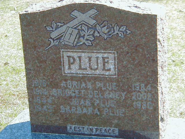Date Apr 10 1939 & location St. Columban per "Descendants of Francis Plew", sent to me by John Plue, Jan 5, 2010.1 As of 10 March 1940,her married name was Plue.1 Mary Bridget "Betty" Delaney lived on 18 May 1984 at R. R. 2, Codrington, Northumberland Co., Ontario; "He leaves behind wife (Betty) Mary Bridget Plue (Nee Delaney)." per Death Notice of Adrian Thomas Plue, from The Tweedsmuir Histories of Codrington, copied from microfilme at The Metro Toronto Reference Library, Nov. 2007.1 She died on 23 November 2002 at Brighton Twp., Codrington, Northumberland Co., Ontario, at age 87; Date 2002 per Memorial. Date Nov 23 2002 & location Codrington per "Decendants of Francis Plew", sent to me by John Plue, Jan 5 2010.2 She was buried on 26 November 2002 at Codrington Roman Catholic Cemetery, Brighton Twp., Codrington, Northumberland Co., Ontario; Memorial: (See Exhibit) PLUE; 1916 Adrian Plue 1894; 1814 Bridget Delaney 2002; 1944 Joan Plue 1980; 1945 Barbara Plue -- (Codrington Roman Catholic Cemetery, Codrington, July 2007.)2
