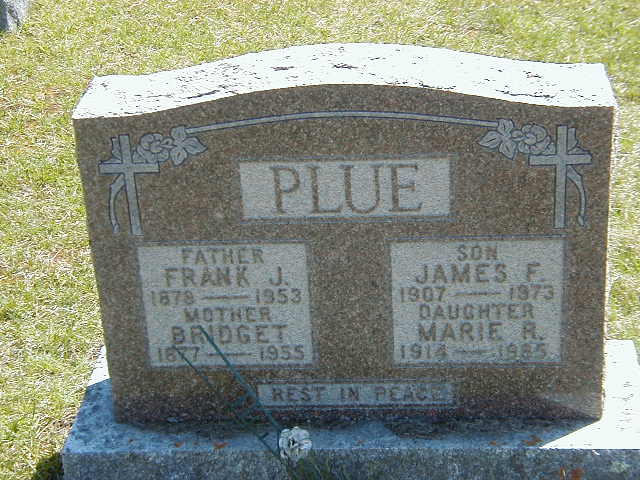 CEMSearch: Name: Frank J. Plue; Born: 1878; Died: 1953; Notes: Husband of Bridget; Buried: Codrington Roman Catholic Cemetery, Brighton Twp; Other names: Bridget Plue (1877-1955), James F. Plue (1907-1973), Marie R. Plue (1914-1985.)7,8