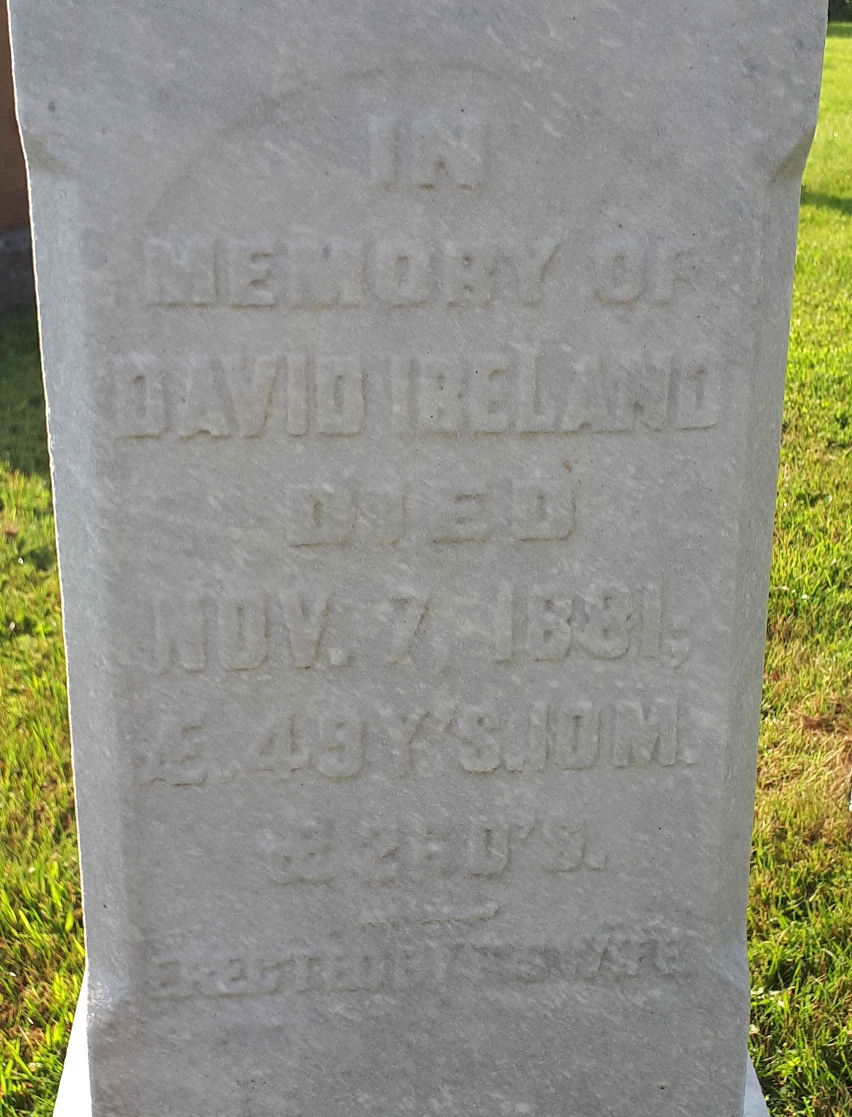 David Ireland was born in 1831 at Murray Twp., Northumbeland Co., Upper Canada; Date 1832 & location Ont. per 1871 Census. Date 1832 & location UC per 1861 Census. Date 1831 & location Cda. per 1851 Census.1,2,3 He appeared on the census of 1852 at Murray Twp., Northumberland Co., Canada West; Age 20 at 1851 Census: see Richard Ireland.1 He married Eliza Powers, daughter of Samuel Powers and Mary Hermon, before 1855 at Northumberland Co., Canada West; per marriage reg'n. of daughter Emma (Hess) Ireland.4 David Ireland lived in April 1861 at Conc 3 Lot 23, Brighton Twp., Northumbeland Co., Canada West; Residence per 1861 Census: Conc 3, Lot 23, Brighton Twp., east 1/4.2 He appeared on the census of April 1861 at Brighton Twp., Northumberland Co., Canada West; Age 29 at 1861 Census: Ireland, David, 29, b. UC, WM, farmer, married; Eliza, 26, b. UC, WM, married; Mary, 6; Walter, 5.2 He lived in April 1871 at Conc 3 Lot 23, Brighton Twp., Northumbeland Co., Ontario; Residence per 1871 Census: Conc 3, Lot 23, Brighton Twp., 75 acres, owner.3 He appeared on the census of April 1871 at Brighton Twp., Northumbeland Co., Ontario; Age 39 at 1871 Census: Ireland, David, 39, b. England, Eng., WM, farmer, married; Eliza, 35, b. Ont., Eng., WM, married; Walter, 14; Mary E., 16; Sarah E., 7; Letitia, 5 months - Nov (1871 Census: Brighton Twp., div. 2, pg. 23, line 19 - Conc 3, Lot 23, 75 acres, owner.)3 He died on 7 November 1881 at Brighton Twp., Northumberland Co., Ontario; Date Nov 7 1881 per Memorial.5 He was buried on 9 November 1881 at Carman Cemetery, Brighton Twp., Carman, Northumberland Co., Ontario; Memorial: (see Exhibit) In; Memory of; David Ireland; Died; Nov. 7, 1881; AE 49 Y's, 10 M; & 26 D's; Ereceted by His Wife (Carman Cemetery, Brighton Twp., image by Dan Buchanan, Aug 12 2023.)5