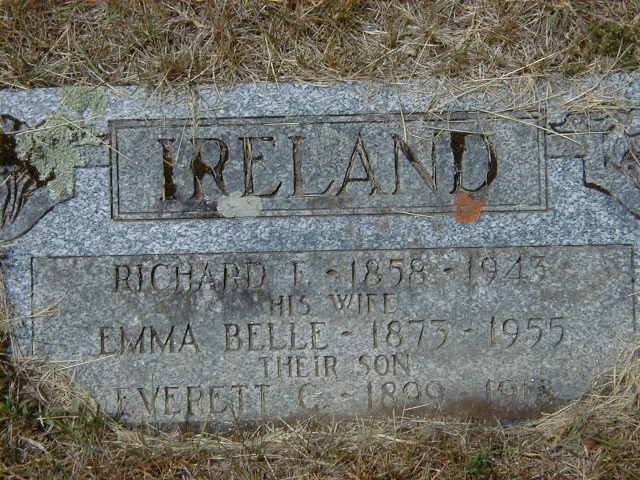 Richard Fletcher Ireland was born on 27 August 1858 at Murray Twp., Northumberland Co., Ontario; Date 1858 per Memorial. Date Aug 27 1858 & location Ont. rural per 1901 Census. Date 1860 & locaiton Ont. per 1871 Census. Date 1858 & location UC per 1861 Census.1,3,4,5 He appeared on the census of April 1861 at Murray Twp., Northumberland Co., Ontario; Age 3 at 1861 Census: see Maria E. Ireland (mother.)1 He appeared on the census of April 1871 at Murray Twp., Northumberland Co., Ontario; Age 11 at 1871 Census: see Maria Ireland (mother.)4 He lived on 9 September 1893 at Conc B Lot 21, Murray Twp., Northumberland Co., Ontario; Land Registry Records (Grant 5189) show that John Rankin sold 20 acres "all that part of the east half lying east and south of the travelled road .. excepting part occupied by Mount Carmel Burying Ground" of lot 21, conc B, Murray Twp. to Robert F. Ireland. ITS Date: Sep 9 1893. Reg'n. Date: Sep 11 1893. (Ontario Land Registry Records, Northumberland Co., Murray Twp., Conc B, Lot 21, Book 003, pg. 220 of 261, pg 02, copied from OnLand.ca by Dan Nov 22 2020.)6 He married Emma Bell Huff, daughter of Alger Hurlburt Huff and Victoria Kingsley, on 22 December 1897 at Ameliasburgh Twp., Huff's Island, Prince Edward Co., Ontario; Marriage Reg'n.#012616: Groom: Richard F. Ireland; Age: 39; Res. & Born: Smithfield; Status: bachelor; Occ.: farmer; Parents: R. Ireland & M. Waldron; Bride: E. Bell Huff; Age: 24; Res. & Born: Huff's Island; Status: spinster; Parents: Alger Huff & Victoria Kingsley; Wit.: M. C. & Annie Huff, Huff's Island; Date: Dec 22 1897; Place: Huff's Island; Rel.: Meth; Performed by: Rev. J. Moran (Ontario Marriage Registration, #012616-1897, ancestry.com.)2,7 Richard Fletcher Ireland lived in April 1901 at Conc 2, Lot 20, Murray Twp., Northumberland Co., Ontario; Residence at 1901 Census: Conc 2, Lot 20, Murray Twp.3 He appeared on the census of April 1901 at Murray Twp., Northumberland Co., Ontario; Age 42 at 1901 Census: Ireland, Richard, 42, b. Ont. r. Aug 27 1858, Eng., Meth., farmer, married; Bell, 27, b. Ont. r. Jul 23 1873, Ger., Meth., married; Evertte, 2, b. Ont. r. May 29 1898, Eng., son; Maria, 74, b. Ont. r. Jun 22 1826, Eng., Meth., mother, widow (1901 Census Online: Murray Twp., dist. 95, sub-dist. g-2, pg. 3, line 19, T-6485 - Conc 2, Lot 20.)3 He died in 1932 at Ontario; Date 1932 & location Ont. per GEDCOM of Dick Oke, May 25, 2008.2 He was buried in 1932 at Greenwood Cemetery, Smithfield, Northumberland Co., Ontario; Memorial: (See Exhibit) IRELAND; Richard E. - 1858 - 1943; His Wife; Emma Belle - 1875 - 1955; Their Son; Everett C. - 1899 - 19?? (Greenwood Cemetery, Smithfield, June 5, 2005.)5