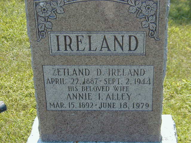 Annie Irene Alley was born on 15 March 1892 at Murray Twp., Northumberland Co., Ontario; Date Mar 15 1892 per Memorial. Date Mar 1892 & location Ont. per 1911 Census. Date Mar 15 1892 & location Ont. rural per 1901 Census. Date 1892 & location Murray Twp. per marr. reg'n.1,2,3,4 She appeared on the census of 16 April 1901 at Murray Twp., Northumberland East Co., Ontario; Age 9 at 1901 Census: see William Alley.3 She appeared on the census of 7 June 1911 at Murray Twp., Northumberland East Co., Ontario; Age 19 at 1911 Census: see John Alley (brother.)4 As of 5 September 1917,her married name was Ireland.1 She married Zetland D. Ireland, son of Walter Herman Ireland and Signoretta "Estella" Lowe, on 5 September 1917 at Murray Twp., Northumberland Co., Ontario; Marriage Reg'n.#014253: Groom: Zetland D. Ireland; Age: 30; Res. & Born: Brighton Twp; Status: bachelor; Occ.: farmer; Rel.: Meth; Parents: Walter Herman Ireland & Stella Lowe; Bride: Annie Irene Alley; Age: 25; Res. & Born: Murray Twp; Status: spinster; Rel.: Meth; Parents: William Alley & Jane Sharpe; Wit.: George W. & Coral Adams, Hilton; Date: Sep 5 1917; Place: Murray Twp; Performed by: W. ....ey, Wooler, Meth; Sworn: Trenton, Aug 23 1917 (Ontario Marriage Registration, #014253-1917, ancestry.com.)5 Annie Irene Alley died on 18 June 1979 at Ontario at age 87; Date June 18, 1979 per Memorial.2 She was buried on 21 June 1979 at Carman Cemetery, Brighton Twp., Northumberland Co., Ontario; Memorial: (See Exhibit) IRELAND; Zetland D. Ireland; April 22, 1887 - Sept. 2, 1944; His Beloved Wife; Annie I. Alley; Mar 15, 1892 - June 18, 1979 (Carman Cemetery, Brighton Twp., June 25, 2005.)2