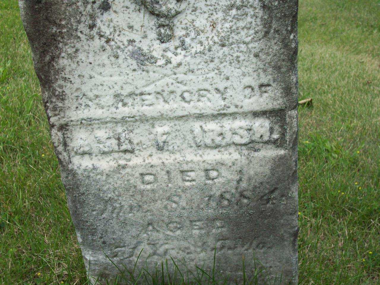 Note: There is a record a couple of pages after Peter Irish for "Daniel Irish; no land; lab."???3 He appeared on the census of 1850 at Conc 2 Lot 18, Cramahe Twp., Northumberland Co., Canada West; 1850 Census: Asa F. Irish; Conc 2, Lot 18, occ., non-prop; Total 5 persons.3 He lived in 1852 at Conc 3 Lot 18, Cramahe Twp., Northumberland Co., Canada West; Agr. Census: Name: A. F. Irish; Conc 3, Lot 1, 50 acres.3 He appeared on the census of 1852 at Cramahe Twp., Northumberland Co., Canada West; Age 39 at 1851 Census: Irish, Asa F., 39, b. Cda., Bapt., farmer, married; Rebecca, 31, b. Cda., Bapt., married; Emma, 11; George W., 10; Edgar A., 8; Albina, 2 (1851 Census: Cramahe Twp., Nortumberland Co., pg. 81 of 131, line 11 - ancestry.ca.)3 He appeared on the census of April 1861 at Cramahe Twp., Northumberland Co., Canada West; Age 48 & location CW per 1861 Census: Irish, Asa, 48, b. UC, EM, farmer, married; Rebecca, 40, b. UC, EM, married; Alvira, 24, b. UC, EM, single; Emma, 19; George, 21, b. UC, EM, single; Edgar, 19; Albina, 17; Adeline, 15; Arthur, 13; Agnes, 11; Flora, 9 (1861 Census: Cramahe Twp.)7 He lived in April 1871 at Conc 5 Lot 15, Cramahe Twp., Northumberland Co., Ontario; Residence per 1871 Census: Conc 5, Lot 15, Cramahe Twp., 100 acres, tenant.2 He appeared on the census of April 1871 at Cramahe Twp., Northumberland Co., Ontario; Age 59 at 1871 Census: Irish, Asa, 59, b. Ont., Irish, WM, farmer, married; Rebecca, 51, b. Ont., Scot., WM, married; Albina, 18, b. Ont., Irish, WM; Adeline, 17; Arthur, 15; Agnes, 12; Flora, 11; Alberta, 9 (1871 Census: Cramahe Twp., div. 2, pg. 18, line 5 - Conc 5, Lot 15, 100 acres, tenant.)2 He appeared on the census of April 1881 at Brighton Twp., Northumberland Co., Ontario; Age 68 at 1881 Census: Irish, Asa, 68, b. Ont., Eng., EM, farmer, married; Rebecca, 60, b. Ont., Scot., EM, married; Adaline, 28, b. Ont., Eng., EM, single; Arthur, 25, b. Ont., Eng., EM, single; Alberta, 18 (familysearch.org.)6 He died on 8 January 1884 at Cramahe Twp., Northumberland Co., Ontario, at age 71; Date Jan 8 1884 per Memoral.9 He was buried on 10 January 1884 at Salem Cemetery, Cramahe Twp., Salem, Northumberland Co., Ontario; Memorial: (See Exhibit) In Memory of; Asa F. Irish; Died; Jan 8, 1884; Aged; 71 Yrs. & ? MO. (Salem Cemetery, Cramahe Twp., Jul 6 2009)