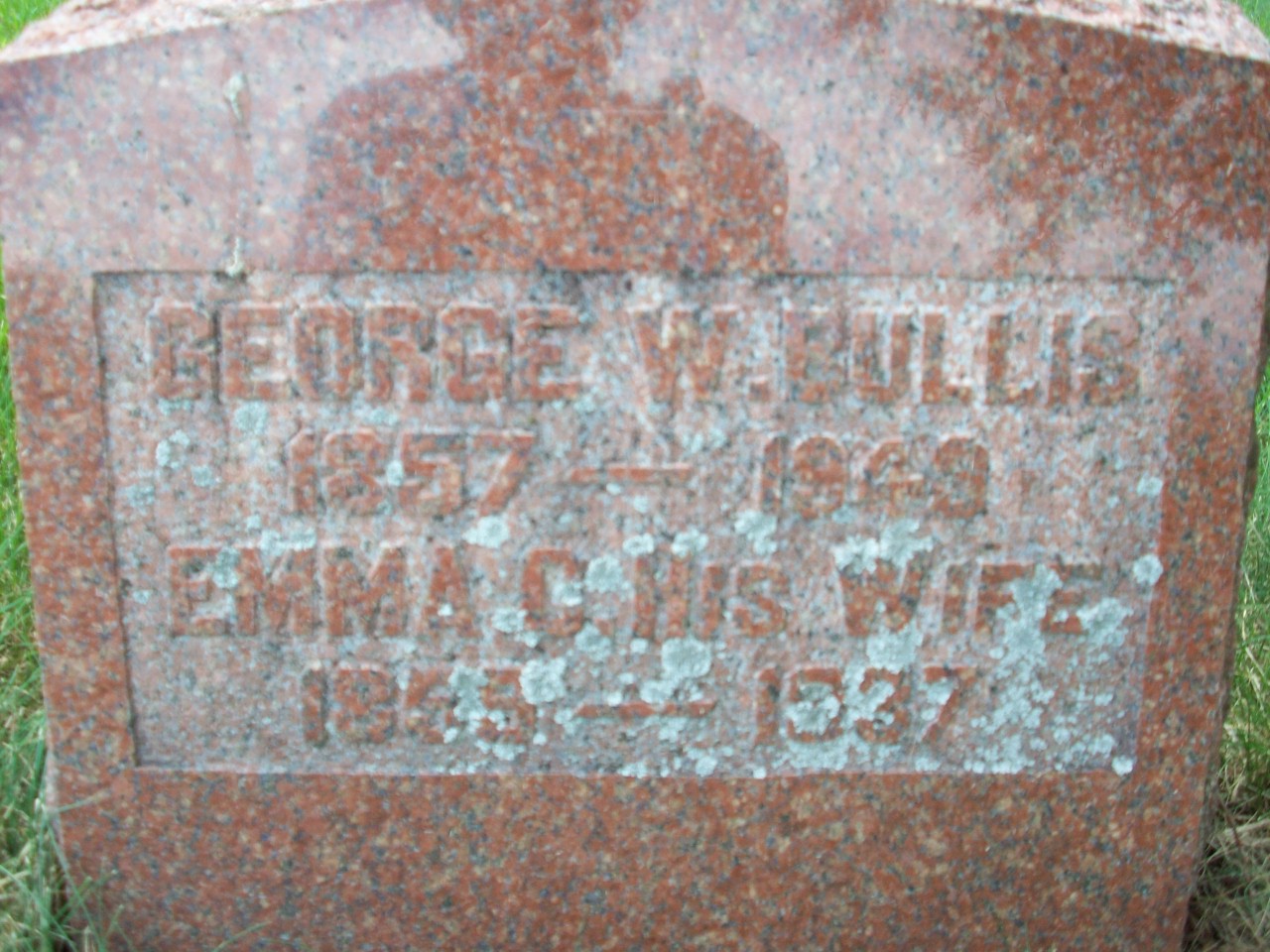 George W. Bullis was born on 22 April 1857 at Leeds Co., Ontario; Date 1857 per Memorial. Date 1857 & location Ont. per 1921 Census. Date Apr 22 1857 & location Ont. rural per 1901 Census. Date 1857 & location Ont. per 1871 Census. per marriage reg'n. of daughter Vera Clarke (Bullis) Ireland. Date Apr 22 1857 & location Leeds Co. per family tree of dougsly1 on ancestry.com, Jan 14 2016.1,2,3,4,5,6 He appeared on the census of April 1871 at Bastard Twp., South Leeds Co., Ontario; Age 14 at 1871 Census: see Hiram Bullis.5 He married Emma A. Clarke, daughter of James Clarke and Nancy M. Cooley, on 24 December 1879 at Brighton Twp., Northumberland Co., Ontario; per marriage reg'n. of daughter Vera Clarke (Bullis) Ireland. Date Dec 24 1879 & location Brighton Twp. per family tree of dougsly1 on ancestry.com, Jan 14 2016.1,2 George W. Bullis appeared on the census of 16 April 1901 at Brighton Twp., Northumberland Co., Ontario; Age 42 at 1901 Census: see Hiram Bullis.3 He appeared on the census of 2 June 1921 at Brighton Twp., Northumberland Co., Ontario; Age 64 at 1921 Census: Bullis, George, 64, b. Ont., p.b. Ont., Irish, Meth., farmer, married; Emma, 62, b. Ont., Ireland & Ont., Irish, Meth., married (1921 Census: Brighton Twp., Northumberland Co., dist. 107, sub-dist. 3, pg. 2, line 28 - ancestry.com.)4 He lived on 20 December 1937 at R. R. # 3, Brighton, Northumberland Co., Ontario; Informant for Death Reg'n. of his wife Emma A. (Clarke) Bullis.7 He was buried in 1940 at Greenwood Cemetery, Smithfield, Northumberland Co., Ontario; Memorial: (See Exhibit) George W. Bullis; 1857 - 1940; Emma C. his wife; 1859 - 1937 (Greenwood Cemetery, Smithfield, Jun 30 2013.)6 He died in 1940 at Ontario; Date 1940? per Memorial.6