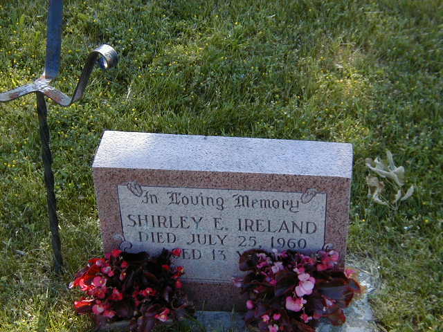 Shirley Ireland was born in 1947 at Ontario; Date 1947 per Memorial. per memorial of parents.1 She died on 25 July 1960 at Ontario; Date Jul 25 1960 per Memorial.1 She was buried on 28 July 1960 at Carman Cemetery, Brighton Twp., Northumberland Co., Ontario; Memorial: (See Exhibit) In Loving Memory; Shirley E. Ireland; Died July 25, 1960; Aged 13 Years (Carman Cemetery, Brighton Twp., June 26, 2005.)1