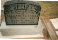 Mary E. ? was born in 1893; Date 1893 per Memorial.1 As of circa 1915,her married name was Speirs.1 She married William "Alexander" Speirs, son of Alexander Speirs and Aleson "Alice" Redpath, circa 1915 at Saskatchewan; per Memorial.1 Mary E. ? was buried in 1982 at Hillcrest Cemetery, Shaunavon, Saskatchewan; Memorial: (See Exhibit) SPEIRS; In Loving Memory; of; Alexander Speirs; 1877 - 1949; Mary E. Speirs; 1893 - 1982 (Hillcrest Cemetery, Shaunavon, Saskatchewan - image sent to me by Nora Redpath, June 8, 2008.)1,2 She died in 1982 at Shaunavon, Saskatchewan; Date 1982 per Memorial.1