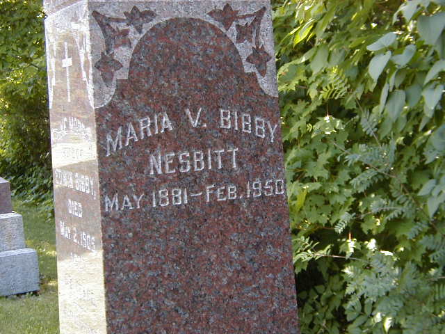 Marie Victoria Bibby was born on 10 May 1881 at Brighton, Northumberland Co., Ontario; Birth Reg'n.#021780: Name: Maria Bibby; Date: May 10 1881; Parents: Edwin Bibby & Jane Morris; Inf.: E. Bibby, Merchant, Brighton; Reg'd.: May 20 1881; Phys.: A. E. Fife; Reg'r.: M. K. Lockwood (Ontario Birth Registration, #021780-1881, ancestry.com) Date 1880 & location Brighton per marriage reg'n. - Samuel Nesbitt.4,2 She appeared on the census of April 1891 at Brighton, Northumberland Co., Ontario; Age 9 at 1891 Census: see Edwin Bibby.5 She appeared on the census of April 1901 at 10 Young St., Brighton, Northumberland Co., Ontario; Age 20 at 1901 Census: see Edwin Bibby.6 As of 30 March 1931,her married name was Nesbitt.2 She lived on 30 March 1931 at Toronto, York Co., Ontario; Residence Toronto per marriage reg'n. - Samuel Nesbitt.2 She married Samuel Grierson Murray Nesbitt, son of James Nesbitt and Agnes Clark, on 30 March 1931 at Hamilton, Wentworth Co., Ontario; Marriage Reg'n.#023080: Groom: Samuel G. M. Nesbitt; Age: 71; Res. & Born: Brighton; Status: widower; Occ.: manufacturer; Rel.: Pres; Parents: James Nesbitt & Agnes Clarke; Bride: Marie Victoria Bibby; Age: 51; Res.: Toronto; Born: Brighton; Status; spinster; Occ.: school teacher; Rel.: Anglican; Parents: Edwin Bibby & Jane Morris; Expected Place of Marr.: Hamilton; Date: Mar 30 1931; Place: Hamilton; Wit.: Helen E. Downey, Toronto & R. J. Innes, Hamilton; Performed by: Beverley Kethen, Hamilton, Pres., #1345; Swrn: Brighton Village, Mar 20th 1931; Reg'r.: Oscar L. Morrow, Brighton (Ontario Marriage Registration, #023080-1931, ancestry.ca.)2 Marie Victoria Bibby died in February 1950 at Ontario at age 68; Date Feb 1950 per Memorial.3 She was buried in February 1950 at Mount Hope Cemetery, Brighton, Northumberland Co., Ontario; Memorial: (See Exhibit) Maria V. Bibby; May 1881 - Feb 1950 (Mount Hope Cemetery, Brighton, June 30 2008.)3