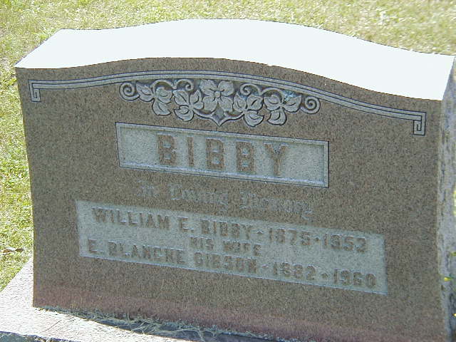Eliza Blanche Gibson was born on 1 March 1882 at Hungerford Twp., Roslin, Hastings Co., Ontario; Birth Reg'n.#901400: Name: Eliza Blanche Gibson; Date: Mar 1 1882; Parents: William Thomas Gibson, Roslin, farmer & Mary Ellen Bennett; Phys.: Dr. Hudson; Inf.: Francis Oswald Bennett, uncle; Reg'd.: Jun 22 1940, Belleville (Ontario Late Birth Registration, #901400-1940, ancestry.com) Date 1882 & location Ont. per 1931 Census. Date 1883 & location Roslin per marr. reg'n.1,4,3 She lived on 14 January 1922 at Belleville, Hastings Co., Ontario; Residence Belleville per marr. reg'n.1 As of 14 January 1922,her married name was Bibby.1 She married William Edward Bibby, son of Edwin Bibby and Jane Morris, on 14 January 1922 at Belleville, Hastings Co., Ontario; Marriage Reg'n.#011749: Groom: William Edward Bibby; Age: 47; Res.: Brighton; Born: Brighton; Status; bachelor; Occ.: merchant; Rel.: Pres; Parents: Edwin Bibby, b. North Wales & Jane Morris; Bride: Eliza Gibson; Age: 39; Res.: Belleville; Born: Roslin; Rel.: Pres; Parents: William Gibson, b. Roslin & Mary Ellen Bennett; Wit.: Mina Victoria Bibby, Toronto & Eunice May Miller, Brighton; Date: Jan 14 1922; Place: Belleville; Performed by: Alexander S. Kerr, Belleville, Pres; Sworn: Brighton, Jan 9 1922 (Ontario Marriage Registration, #011749-1922, ancestry.com.)5 Eliza Blanche Gibson appeared on the census of 1931 at Young St., Brighton, Northumberland Co., Ontario; Age 49 at 1931 Census: see William Bibby.3 She lived in 1935 at Brighton, Northumberland Co., Ontario; "19 Bibby, William, merchant, Brighton" & "20 Bibby, Mrs. William (W), married woman, Brighton" Canada Voters Lists, 1935, Northumberland Co., pg. 15 of 126, ancestry.ca.6 She lived in 1940 at Brighton, Northumberland Co., Ontario; "23 Bibby, William, merchant, Brighton" & "24 Bibby, Mrs. William - Brighton" Canada Voters Lists, 1940, Northumberland Co., pg. 12 of 124, ancestry.ca.6 She lived in 1949 at Brighton, Northumberland Co., Ontario; "21 Bibby, William, gentleman, Brighton" & "22 Bibby, Mrs. William - Brighton" Canada Voters Lists, 1949, Northumberland Co., pg. 38 of 156, ancestry.ca.6 She lived on 15 March 1955 at Village Lot 16, Young St. West, Brighton, Northumberland Co., Ontario; Land Registry Records (Grant 9043) show that Toronto General Trust Corp & Eliza B. Bibby (Executors of late William E. Bibby) granted "said lot", Village Lot 16, Young St. West, Brighton Village, Northumberland Co. to E. Blanche Bibby for $1. ITS Date: Mar 15 1955. Reg'n. Date: Apr 27 1955. (Ontario Land Registry Records, Northumberland Co., Brighton Village, Book 009, pg. 144 of 220, OnLand.ca.)7 She died in 1960 at Ontario; Date 1960 per Memorial.8 She was buried in 1960 at Mount Hope Cemetery, Brighton, Northumberland Co., Ontario; Memorial: (See Memorial) BIBBY; William E. Bibby - 1875 - 1952; His Wife; E. Blanche Gibson - 1882 - 1960 (Mount Hope Cemetery, Brighton, July 2004.)8