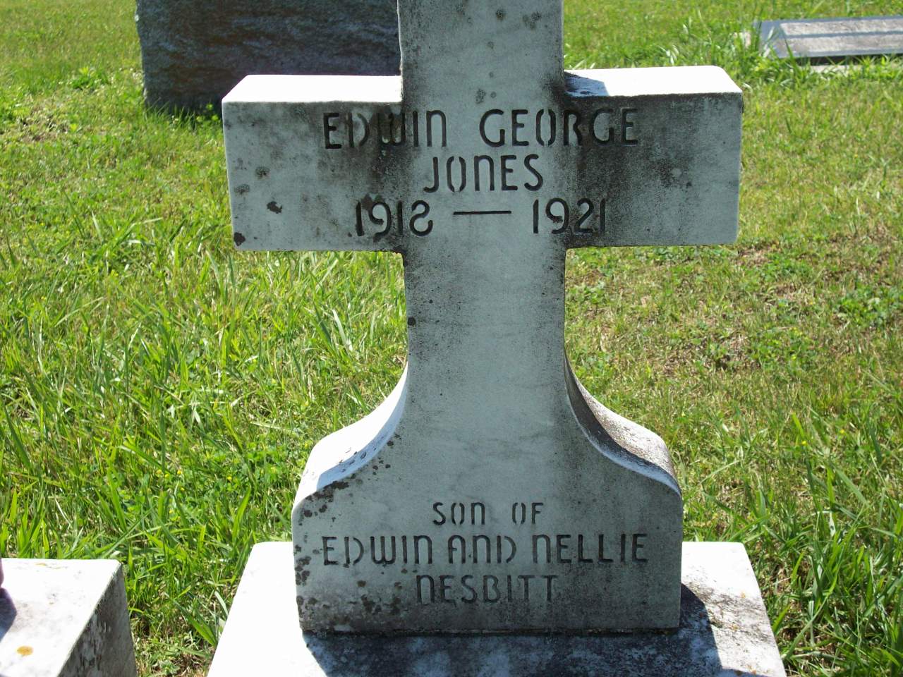 Edwin George Jones Nesbitt was born on 8 April 1918 at Brockville, Ontario; Date 1918 per Memorial. Date Apr 8 1918 & location Brockville per Death Reg'n.1,2 He died on 2 December 1921 at Sanford St., Brighton, Northumberland Co., Ontario, at age 3; Death Reg'n.#023616: Name: Edwin George JOnes Nesbitt; Date: Dec 2 1921; Age: 3y 7m 26d; Place: Sanford St., Brighton; Born: Brickville, Ont., Apr 8 1918; Parents: Edwin J. Nesbitt, b. Brighton & Nellie Foster Jones; Inf.: E. J. Nesbitt, Brighton, father; Burial: Mt. Hope Cemetery, Brighton, Dec 4 1921; Und.: Be. E. Brintnell, Brighton; Cause: bronchitis, pneumonia, 2 days; Phys.: F. M. Dean, Brighton; Reg'd.: Dec 2 1921; Reg'r.: Roblin, Brighton (Ontario Death Registration, #023616-1921, ancestry.com) Date 1921 per Memorial.1,3 He was buried on 4 December 1921 at Mount Hope Cemetery, Brighton, Northumberland Co., Ontario; Memorial: (See Exhibit) Edwin George; Jone; 1912 -1921; Son of; Edwin and Nellie; Nesbitt (Mount Hope Cemetery, Brighton, June 30 2008) Per Death Reg'n.1,2