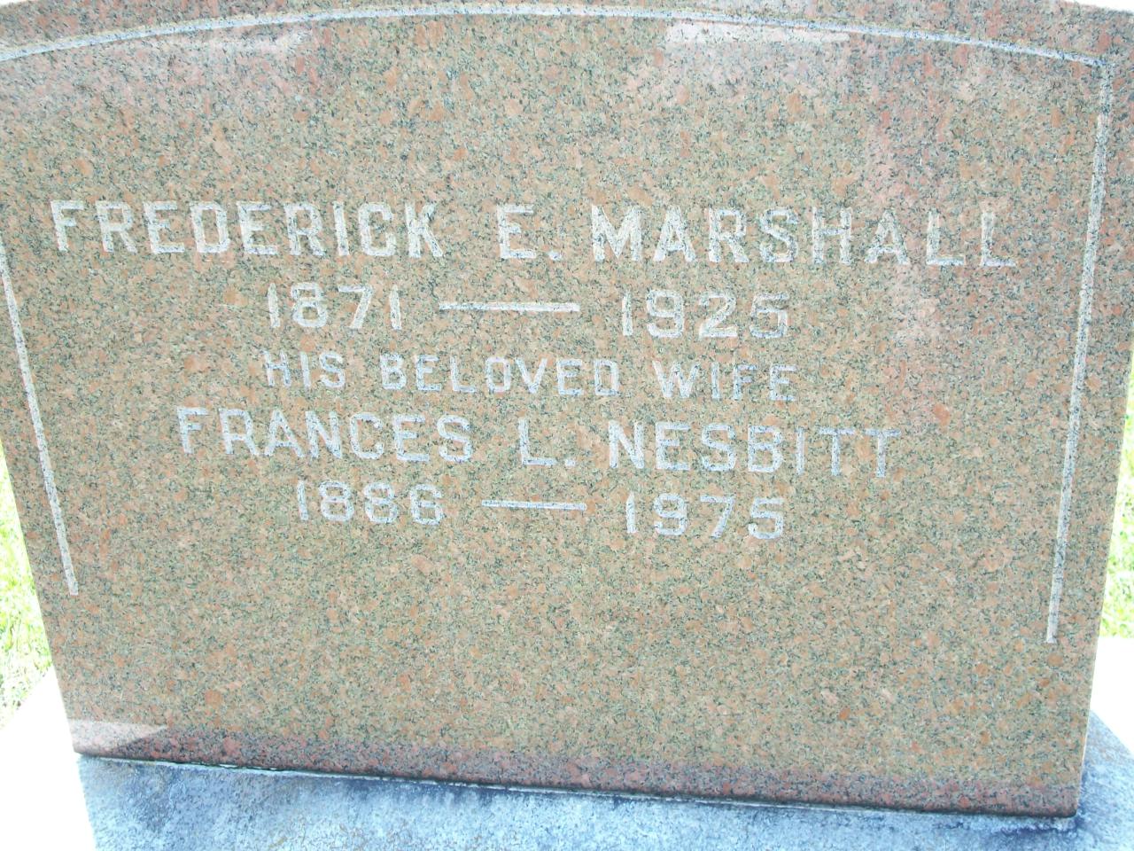 Mr. and Mrs. E. H. Sanford are located in the Sanford block, corner of Young and Dundas streets, where Mr. LaFay had his shop. Mr. La Fay very obligingly moved his stock out to let Mr. Sanford in. The Hydro Electric staff is quite comfortably situated upstairs over G.H. Roblin's hardware store. Marshall and Dingman are giving their customers the same close shaves across the road in the Tire Hospital. The Bank of Commerce were fortunate in securing Butler's fine show rooms, which, while they may not be fitted with the necessary cages, etc., required for banking are handy and substantial. Mr. Robert Ross grocery is running along as usual. McMaster's hardware store and Frise dry goods store, also Brighton Whitewear Co., will be open for business in their same old stands again." from page 269 of History of Brighton Businesses by Susan Brose. in February 1921 at Main St., Brighton, Northumberland Co., Ontario.9 He was "April - Fred Marshall has purchased the Jewellery and Fancy Goods stand of W.W. Porte for the new Drug Store. (5 Main Street)" from page 270 of History of Brighton Businesses by Susan Brose. in April 1921 at 5 Main St., Brighton, Northumberland Co., Ontario.9 He appeared on the census of 11 June 1921 at Ward 2, Brighton, Northumberland Co., Ontario; Age 49 at 1921 Census: Marshall, Frederick, 49, b. Ont., p.b. Ont., Eng., CE, general merchant, married; Frances, 36, b. Ont., p.b. Ont., Eng., CE, married; Barbara, 5; John, 3 (1921 Census: Brighton Village, Northumberland Co., dist. 107, sub-dist. 68, pg. 14, line 35 - Ward 2 - ancestry.ca.)8 He lived on 20 December 1921 at Conc 1 Lot 2, Brighton Twp., Brighton, Northumberland Co., Ontario; Land Registry Records (Grant 6497) show that Frederick E. Marshall sold "part .. lying between Main and Richardson Sts.", part of lot 2 conc 1, Brighton Twp., Northumberland Co. to Francis L. Marshall for $1. ITS Date: Dec 20 1921. Reg'n. Date: Jun 10 1931. (Ontario Land Registry Records, Northumberland Co., Brighton Village, Book 014, pg. 126 of 210, page copied from OnLand.ca by Dan Buchanan, Nov 6 2022.)11 He lived on 20 December 1921 at Conc 1 Lot 2, Brighton Twp., Brighton, Northumberland Co., Ontario; Land Registry Records (Grant 6497) show that Frederick E. Marshall sold "part .. lying between Main and Richardson Sts.", part of lot 2 conc 1, Brighton Twp., Northumberland Co. to Francis L. Marshall for $1. ITS Date: Dec 20 1921. Reg'n. Date: Jun 10 1931. (Ontario Land Registry Records, Northumberland Co., Brighton Village, Book 014, pg. 126 of 210, page copied from OnLand.ca by Dan Buchanan, Nov 6 2022.)11 He was "12 Main Street - Fire #112, 5th store ... 1925 - 1926 - Marshall Drug Store - from 5 Main" from page 45 of History of Brighton Businesses by Susan Brose. in 1925 at 12 Main St., Brighton, Northumberland Co., Ontario.9 He died on 3 December 1925 at Toronto, York Co., Ontario, at age 53; Death Reg'n.#006687: Name: Frederick Edward Marshall; Date: Dec 3, 1925; Age: 53y; Place: Wellesley Hospital, Toronto, 14d; Born: Brighton, Ont., Jun 12 1872; Nat.: British; Status; married; Occ.: Druggist; Parents:John Marshall ..; Inf.: A.S. Miller, Brighton, brother-in-law; Burial: Brighton; Und.: S.N. Johnston Co., 465 Gerrard St. E., TO; CausE: brain tumor, 12d; Phys.: H.G. MacKenzie, 102 College St., TO; Reg'd.: Dec 4 1925 (Ontario Death Registration, #006687-1925, ancestry.ca) Date 1925 per Memorial. Date Dec 3 1925 & location Toronto per family tree of Eudene123 on ancestry.ca, Sep 30 2017.1,7,12 He was buried on 5 December 1925 at Mount Hope Cemetery, Brighton, Northumberland Co., Ontario; Memorial: (See Exhibit) Frederick E. Marshall; 1871 - 1925; His Beloved Wife; Frances L. Nesbitt; 1886 - 1975 (Mount Hope Cemetery, Brighton, June 30 2008.)1