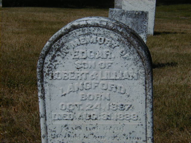 Henry Edgar Langford was born on 24 October 1887 at Percy Twp., Northumberland Co., Ontario; Date Oct 24 1887 per Memorial. Date Oct 21 1887 & locaiton Percy per GEDCOM of Ellie Cameron (ecam@home.com) July 19 2016.1,2 He died on 31 August 1888 at Percy Twp., Northumberland Co., Ontario; Date Aug 13 1888 per Memorial.1 He was buried on 2 September 1888 at Stone's Cemetery, Percy Twp., Northumberland Co., Ontario; Memorial: (See Exhibit) In Memory of; Edgar; Son of; Robert & Lillian; Langford; Born; Oct. 24, 1887; Died Aug. 31, 1888 (Stone's Cemetery, Percy Twp., June 25 2007.)1