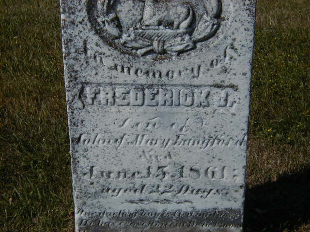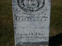 Frederick J. Langford was born on 24 March 1861 at Cramahe Twp., Northumberland Co., Canada West; Date Mar 24 1861 per Memorial - age 22 days at death June 15, 1861.1 He died on 15 June 1861 at Cramahe Twp., Northumberland Co., Canada West; Date June 15, 1861 per Memorial.1 He was buried on 17 June 1861 at Stone's Cemetery, Percy Twp., Northumberland Co., Canada West; Memorial: (See Exhibit) In Memory of; Frederick J; Son of; John & Mary Langford; Died; June 15, 1861; Aged 22 Days (Stone's Cemetery, Percy Twp., June 25 2007.)1