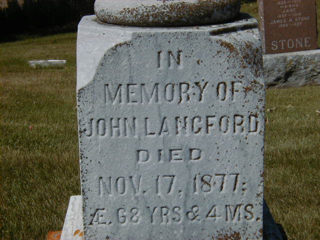 CemSearch: Name: John Langford; Born: Jul 1809; Died: Nov 17 1877; Age: 68y 4m; ID: STONES064; Other names: Langford, Mary [Hunt] (1816-1892); Cemetery: Stone's Cemetery, Conc 1, E. Lot 15, Percy Twp., Northumberland Co; Note: Born England, Died Cramahe Twp. Husband of Mary Hunt. Father of 14 children; Sarah S. (James C.) Curtis, Imanuel, William Henry, John Jr, Edwin Wallace, Mary Jane, David Nelson, Louisa Alberta (George)Inglis, Frances Adelia (Adam)Smith, Samuel, Robert Albert, Frederick James, Job. Another son William (Sept. 6 1839-Aug. 23, 1841) born adn died England. Emigrated from England in 1842. Info from gr.gr. granddaughter Dianne Pettey. (https://cemsearch.ca/burial/?pid=STONES064%5E0.)2,6
