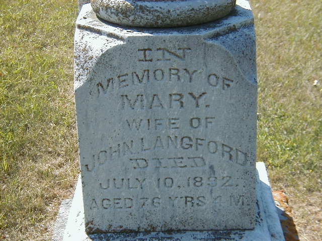 John Langford was born in June 1809 at England; Date June 1809 per Memorial. Date Jul 1809 & location England per CemSearch. Date 1809 & location England per 1871 Census. Date 1809 & location England per 1861 Census. Date 1807 & location England per 1851 Census. per marriage reg'n. of son Robert A. Langford.1,2,3,4,5,6 He married Mary Hunt circa 1834 at England; per 1861 Census. per marriage reg'n. of daughter Francis A. (Langford) Smith. per marriage reg'n. of son Robert A. Langford.1,4 John Langford immigrated in 1842 to Canada West; Immigration 1842 per 1901 Census of son Manuel Langford.7 He appeared on the census of 1846 at Conc 2 Lot 24, Percy Twp., Northumberland Co., Canada West; 1846 Assessment: John Langford; Conc 2, Lot 24, North Half; 30 acres cult., 70 acres uncult. He appeared on the census of 1848 at Conc 2 Lot 24, Percy Twp., Northumberland Co., Canada West; 1848 Census: John Langford; Conc 2, Lot 24, occ., non-prop; farmer. He appeared on the census of 1850 at Conc 2 Lot 24, Percy Twp., Northumberland Co., Canada West; 1850 Census: John Langford; Conc 2?, Lot 24, occ., non-prop; Total Persons: 8. He appeared on the census of 1852 at Percy Twp., Northumberland Co., Canada West; Age 44 at 1851 Census: Langford, John, 44, b. England, CE, yeoman, married; Mary, 36, b. England, CE, married; Sarah, 18, b. England, EM, single; Manuel, 15, b. England, CE; William H., 10, b. Cda., CE; John, 8, b. Cda; Edwin W., 6, b. Cda; Mary J., 4; David N., 1 (1851 Census: Percy Twp.)5 He appeared on the census of April 1861 at Cramahe Twp., Northumberland Co., Canada West; Age 52 at 1861 Census: Langford, John, 52, b. England, WM, farmer, married; Mary, 46, b. England, WM, married; Sarah, 26, b. England, WM, single; Manuel, 24, b. England, WM, single; William, 19, b. CW; John, 17; ?Enlivan?(m), 15; Mary, 13; Nelson, 11; Louisa, 9; Francis, 6; Samuel, 4; Robert, 2.4 He appeared on the census of April 1871 at Cramahe Twp., Northumberland Co., Ontario; Age 62 at 1871 Census: Langford, John, 62, b. England, English, EM, farmer, married; Mary, 55, b. England, Eng., EM, married; Mary Jane, 22, b. Ont., Eng., EM, single; Louisa, 18; Francis, 16; Nelson, 19; Samuel, 14; Robert, 12; Job, 8 (1871 Census: Cramahe Twp., div. 3, pg. 46, line 9 - Conc 10, Lot 19, 100 acres, owner.)3 He lived in April 1871 at Conc 10 Lot 19, Cramahe Twp., Northumberland Co., Ontario; Residence per 1871 Census: Conc 10, Lot 19, Cramahe Twp., 100 acres, owner.3 He died on 17 November 1877 at Cramahe Twp., Northumberland Co., Ontario, at age 68; Date Nov 17 1877 per Memorial. Date Nov 17 1877 & location Cramahe Twp. per CemSearch.2,6 He was buried on 19 November 1877 at Stone's Cemetery, Percy Twp., Northumberland Co., Ontario; Memorial: (See Exhibit) In; Memory of; John Langford; Died; Nov. 17, 1877; AE 68 Yrs & 4 Ms. (Stone's Cemetery, Percy Twp., June 25 ,2007)