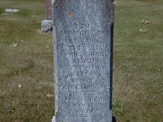 Samuel Langford was born in 1857 at Cramahe Twp., Northumberland Co., Canada West; Date 1857 & location Ont. per 1871 Census. Date 1857 & location CW per 1861 Census. Date 1858 & location Cramahe Twp. per marr. reg'n.1,2,3 He appeared on the census of April 1861 at Cramahe Twp., Northumberland Co., Canada West; Age 4 at 1861 Census: see John Langford.2 He appeared on the census of April 1871 at Cramahe Twp., Northumberland Co., Ontario; Age 14 at 1871 Census: see John Langford.1 He lived on 1 February 1886 at Cramahe Twp., Northumberland Co., Ontario; Residence Cramahe Twp. per marr. reg'n.3 He married Mary Elizabeth Ross, daughter of Hugh Ross and Clarissa ?, on 1 February 1886 at Seymour Twp., Northumberland Co., Ontario; Marriage Reg'n.#008401: Groom: Samuel Langford; Age: 28; Res. & Born: Cramahe Twp; Status; bachelor; Occ.: farmer; Parents: John Langford & Mary Hunt; Bride: Mary Elizabeth Ross; Age: 20; Res. & Born: Seymour Twp; Status: spinster; Parents: Hugh Ross & Clarissa Powell; Wit.: Robert Langford, Cramahe Twp. & Emma Ross, Seymour Twp; Date: Feb 1 1886; Place: Seymour Twp; Rel.: Meth. & Pres; Peformed by: Donald Sutherland; Reg'r.: R. P. Hurlburt (Ontario Marriage Registration, #008401-1886, ancestry.com.)4 Samuel Langford died on 11 April 1890 at Ontario; Date Apr 11 1890 per Memorial.5 He was buried on 13 April 1890 at Stone's Cemetery, Percy Twp., Northumberland Co., Ontario; Memorial: (See Exhibit) In; Memory of; Samuel Langford; Died; April 11, 1890; Aged; 33 Y'rs 1 M. 11 D; William K; son of; S. & M. E. Langford; Died; Feb. 6, 1889; Aged; 7 Weeks (Stone's Cemetery, Percy Twp., June 25 2007.)5