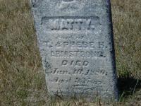Matty Armstrong was born in 1877 at Brighton Twp., Northumberland Co., Ontario; Date 1887 per Memorial - age 3 years at death Jan 10 1880.1 He died on 10 January 1880 at Brighton Twp., Northumberland Co., Ontario; Date Jan 10 1880 per Memorial.1 He was buried on 12 January 1880 at Stone's Cemetery, Percy Twp., Northumberland Co., Ontario; Memorial: (See Exhibit) Matty; Son of; T. & Phebe B; Armstrong; Died; Jan 10, 1880; Aged 3 Years (Stone's Cemetery, Percy Twp., June 25 2007.)1