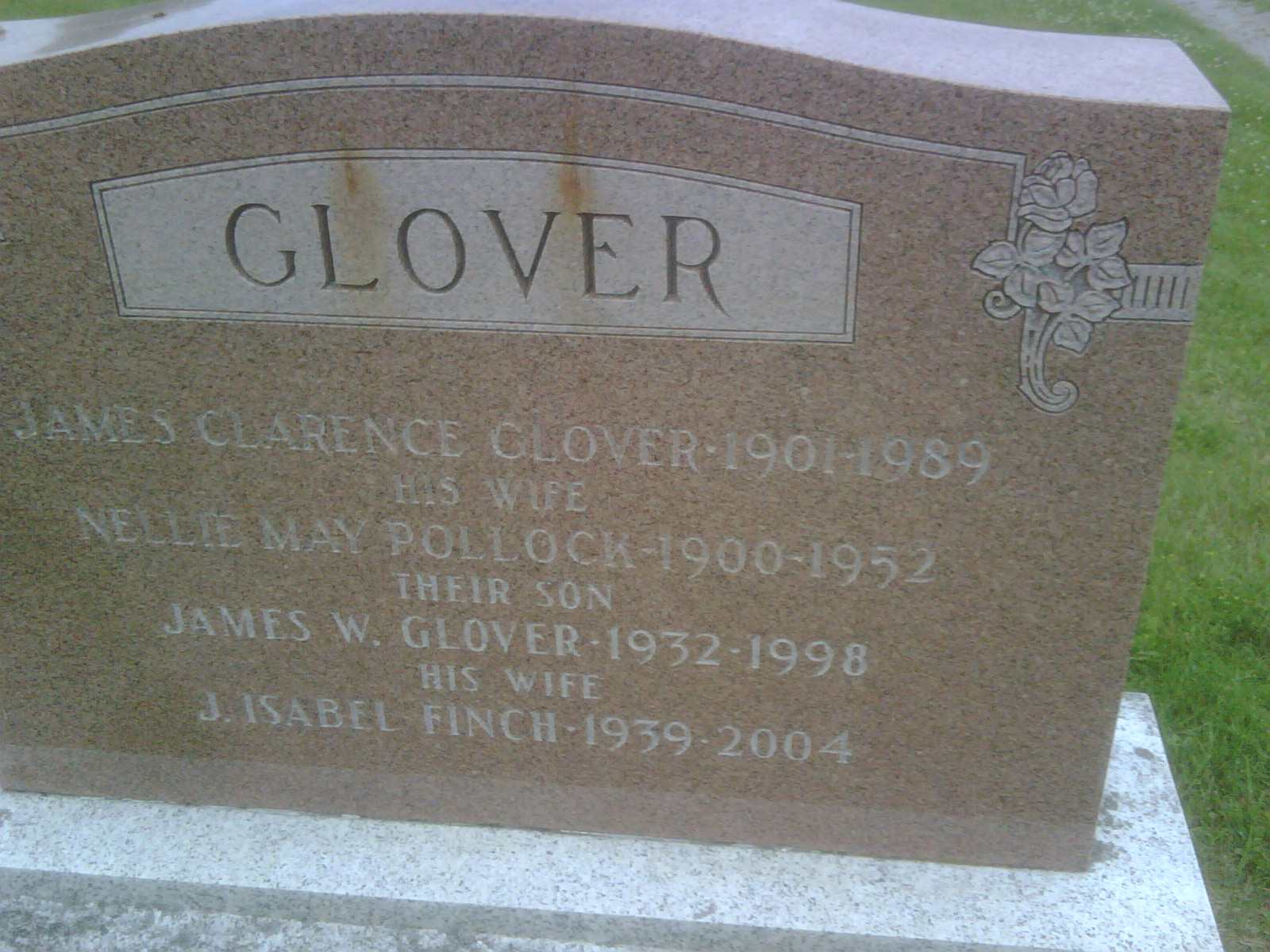 Date March 25 1925 per family tree of Steven Glover on ancestry.ca, March 28 2018.2,5 James Clarence Glover died on 26 August 1989 at Campbellford, Northumberland Co., Ontario, at age 88; Date 1989 per Memorial. Date Aug 26 1989 & location Campbellford per family tree of Steven Glover on ancestry.ca, March 28 2018.2,4 He was buried on 29 August 1989 at Warkworth Cemetery, Warkworth, Northumberland Co., Ontario; Memorial: (See Exhibit) GLOVER; James Clarence Glover 1901-1989; His Wife; Nellie May Pollock 1900-1952; Their Son; James W. Glover 1932-1998; His Wife; J. Isabel Finch 1939-2004 (Warkworth Cemetery, Warkworth, July 12 2009.)4