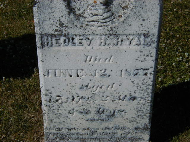 Heldey H. Ryal was born on 6 April 1860 at Cramahe Twp., Northumberland Co., Ontario; Date Apr 6? 1860 per Memorial. Date 1860 & location Ont. per 1871 Census. Date 1860 & location UC per 1861 Census.1,2,3 He appeared on the census of April 1861 at Cramahe Twp., Northumberland Co., Ontario; Age 1 at 1861 Census: see Richard Ryal.3 He appeared on the census of April 1871 at Cramahe Twp., Northumberland Co., Ontario; Age 11 at 1871 Census: see Richard Ryal.1 He died on 12 June 1877 at Cramahe Twp., Northumberland Co., Ontario, at age 17; Date Jun 12 1877 per Memorial.2 He was buried on 14 June 1877 at Stone's Cemetery, Percy Twp., Northumberland Co., Ontario; Memorial: (See Exhibit) Hedley H. Ryal; Died; june 12, 1877; Aged; 17 Y's & 2 Mo's; & 6? D's (Stone's Cemetery, Percy Twp., June 25 2007.)2