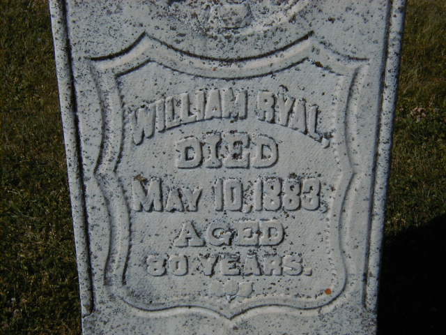 William Ryal Sr. was born in 1803 at England; Date 1803 & location England per Death Reg'n. Date 1803 per Memorial - age 80 at death May 1883. Date 1807 & location England per 1881 Census. Date 1804 & location England per 1871 Census. Date 1806 & location England per 1861 Census. per GEDCOM of Meredith Mullett-Bulloch, July 23, 2008.1,2,3,4,5,6 He married Hannah "Annie" ? before 1830; per GEDCOM of Meredith Mullett-Bulloch, July 23, 2008.1 William Ryal Sr. appeared on the census of 1839 at Percy Twp., Northumberland Co., Ontario; 1839 Assessment: William Ryalls; --. He appeared on the census of 1845 at Conc 1 Lot 13, Percy Twp., Northumberland Co., Ontario; 1845 Assessment: William Ryalls; Conc 1, Lot 13, W 1/2, 90 acres uncult., 10 acres cult. He appeared on the census of 1846 at Conc 1 Lot 13, Percy Twp., Northumberland Co., Ontario; 1846 Assessment: William Ryalls; Conc 1, Lot 13, W 1/2, 30 acres uncult., 10 acres cult. He appeared on the census of April 1861 at Cramahe Twp., Northumberland Co., Ontario; Age 55 at 1861 Census: Rial, Wm, Sr., 55, b. England, WM, farmer, married; Hannah, 54, b. England, WM, married; John, 22, b. UC; Andrew, 20; Samuel, 18.6 He appeared on the census of April 1871 at Cramahe Twp., Northumberland Co., Ontario; Age 67 at 1871 Census: Ryal, William Sr., 67, b. England, Eng., WM, farmer, married; Hannah, 67, b. England, Eng., WM, married; Andrew, 29, b. Ont., Eng., EM, farmer, single; Samuel, 25, b. Ont., Eng., EM, farmer, single (1871 Census: Cramahe Twp., div. 3, pg. 56, line 16 - Conc 10, Lot 20 & 21, 230 acres, owner.)3 He lived in April 1871 at Cramahe Twp., Northumberland Co., Ontario; Residence per 1871 Census: Conc 10, Lot 20 & 21, Cramahe Twp., 230 acres, owner.3 He appeared on the census of April 1881 at Cramahe Twp., Northumberland Co., Ontario; Age 79 at 1881 Census: Ryal, William, 79, b. England, Eng., CM, farmer, widwor; Andrew, 40, b. Ont., Eng., EM, farmer, single; Samuel, 38, b. Ont., Eng., EM, farmer, single (familysearch.org.)2 He died on 18 May 1883 at Cramahe Twp., Northumberland Co., Ontario; Death Reg'n.#011617: Name: William Ryal; Date: May 18 1883; Age: 80; Occ.: farmer; Born: England; Cause: gangrene, 5 weeks; Phys.: Dr. Demorest; Inf.: A. Ryal, son of deceased; Reg'd.: Jun 2 1883; Rel.: EM; Reg'r.: H. P. Gould (Ontario Death Registration, #011617-1883, ancestry.com.)7 He was buried on 20 May 1883 at Stone's Cemetery, Percy Twp., Northumberland Co., Ontario; Memorial: (See Exhibit) William Ryal; Died; May 10, 1883; Aged; 80 years (Stone's Cemetery, Percy Twp., June 25 2007)