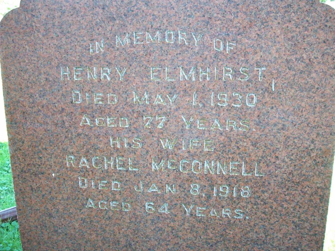 per marriage reg'n. of son Gilbert John Elmhirst.7 Henry Elmhirst lived on 10 March 1880 at Otonabee Twp., Keene, Peterborough Co., Ontario; Witness at marriage of his sister Louisa Elmhirst.1 He appeared on the census of April 1881 at Otonabee Twp., Peterborough Co., Ontario; Age 28 at 1881 Census: see Jane Elmhirst (mother.)3 He appeared on the census of April 1891 at Otonabee Twp., Peterborough Co., Ontario; Age 38 at 1891 Census: Elmhirst, Henry, 38, b. Ont., p.b. England & Scotland, EC, farmer, married; Rachel, 37, b. Ireland, p.b. Ireland, Ec, married; Carrie(f), 13, b. Ont., p.b. Ont. & Ireland; Joseph, 11; Jane, 8; Gilbert, 7; Nettie, 5; O'Neal, Barrie, 25, b. Ireland, p.b. Ireland, RC, lab., single; Elmhirst, James, 33, b. Ont., p.b. England & Scotland, EC, lab., brother, single (1891 Census Online: Otonabee, Twp., dist. 109, sub-dist. p, pg. 45, line 8 - ancestry.com.)4 He appeared on the census of April 1901 at Otonabee Twp., Peterborough Co., Ontario; Age 48 at 1901 Census: Elmhurst, Henry, 48, b. Ont. r. Sep 9 1853, Eng., CE, farmer, married; Rachel, 47, b. Ireland u. Dec 26 1853, Scot., immig. 1860, CE, married; Carrie, (m), ----- single??; Joseph H., 21, b. Ont. r. feb 14 1880, Eng., Ce, son, single; Jane S., 18, b. Ont. r. Jun 20 1883, daughter; Gilbert, 17, b. Ont. r. Apr 5 1884, son; Nettie, 15, b. Ont. r. Sep 26 1886, daughter (1901 Census Online: Otonabee Twp., dist. 106, sub-dist. u-2, pg. 4, line 1 - Conc 3 Lot 23.)2 He lived in April 1901 at Conc 3 Lot 23, Otonabee Twp., Peterborough Co., Ontario; Residence per 1901 Census: Conc 3, Lot 23, Otonabee Twp.2 He appeared on the census of April 1911 at Otonabee Twp., Peterborough Co., Ontario; Age 59? at 1911 Census: Elmhirst, Henry, 59?, b. Ont. Sep 1852, Eng., Bapt., farmer, married; Rachel, 58?, b. Ireland Dec 1853, immig. 1860?, Irish, Bapt., married; Gilbert, 27, b. Ont. Apr 1884, Eng., Bapt., son (1891 Census Online: Otonabee Twp., dist 112, sub-dist. 2, pg. 6 of 11, line 31 - Conc 3, Lot 26.)5 He died on 1 May 1930 at Ontario at age 76; Date May 1 1930 per CEMSearch. Date 1930 per Memorial.6,8 He was buried on 3 May 1930 at Westwood Community Cemetery, Asphodel Twp., Westwood, Peterborough Co., Ontario; Memorial: (See Exhibit) In Memory of; Henry Elmhirst; Died May 1 1930; Age: 77 Years; His Wife; Rachel McConnell; Died Jan 8, 1918; Aged 64 Years (Westwood Cemetery, Otonabee Twp., Sep 7 2008)