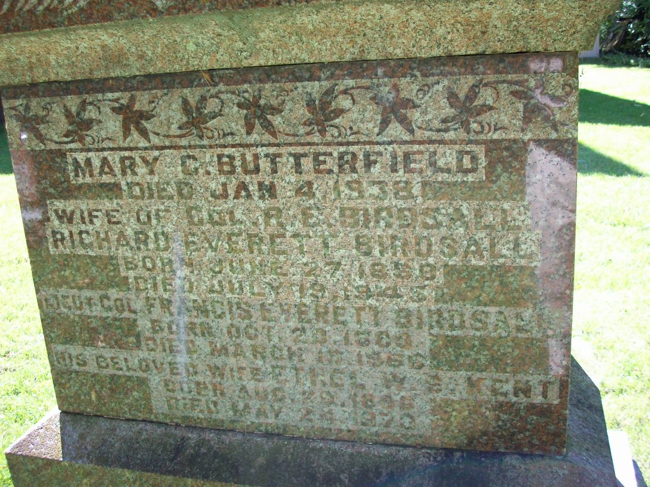 Richard Everett Birdsall was born on 26 June 1860 at Asphodel Twp., Peterborough Co., Canada West; Date Jun 1860 & location Ont. per 1911 Census. Date Jun 27 1860 & location Ont. rural per 1901 Census. Date 1861 & location Ont. per 1881 Census. Date 1861 & location Asphodel Twp. per marr. reg'n. Date 1850-06-27 per CEMSearch.1,2,3,4,5 He appeared on the census of April 1881 at Asphodel Twp., Peterborough Co., Ontario; Age 20 at 1881 Census: see Francis Birdsall.1 He lived in 1884 at Asphodel Twp., Peterborough Co., Ontario; "Francis Birdsall, brother of the above, was born on the family homestead in 183, where he has lived all his life and owns the farm originally secured by his father, by govenment grant, at an early day, consisting in all of about fourteen hundred acres in Otonabee and Asphodel. He was married in 1859 to Amanda E. Birdsall, of Toronto Township, Peel County. They have one child, a son, Richard E. Birdsall, who was born in 1860. He is at present Captain of No. 4 Company, 57th Battalion, Volunteers, and resides at home with his parents." from page 671 of "History of the County of Peterborough", 1884, section "Asphodel Township."6 He married Mary Catherine Butterfield, daughter of John Almon Butterfield and Catherine T. ?, on 11 February 1885 at Asphodel Twp., Norwood, Peterborough Co., Ontario; Marriage Reg'n.#009726: Groom: Richard E. Birdsall; Age: 24; Res. & Born: Asphodel Twp; Status: bachelor; Occ.: farmer; Parents: Frank & Amand Jane Birdsall; Bride: Mary ?Postma? Butterfield; Age: 23; Res. & Born: Norwood; Status: spinster; Parents: John Almon & Postma T. Butterfield; Wit.: Amy Francis, Hastings & Fanny Hatton, Peterborough; Date: Feb 11 1885; Place: Feb 11 1885; Place: Norwood; Rel.: CE; Performed by: Rev. J. Gibson; Reg'r.: W. H. Mullens (Ontario Death Registration, #009726-1885, ancestry.com.)7 Richard Everett Birdsall lived in April 1901 at Conc 1 Lot 1, Asphodel Twp., Peterborough Co., Ontario; Residence per 1901 Census: Conc 1, Lot 1, Asphodel Twp.3 He appeared on the census of April 1901 at Asphodel Twp., Peterborough Co., Ontario; Age 40 at 1901 Census: Birdsall, Richard, 40, b. Ont. r. Jun 27 1860, Eng., CE, farmer, married; Mary C., 38, b. Ont. u. Aug 15 1862, Eng., Ce, married; Ruth B. B., 13, b. Ont. r. daughter; Francis E., 11, b. Ont. r. Oct 20 1889, son (1901 Census Online: Asphodel Twp., dist. 106, sub-dist. b-1, pg. 3, line 23, T-6491 - Conc 1, Lot 1.)3 He appeared on the census of 1911 at Asphodel Twp., Westwood, Northumberland Co., Ontario; Age 50 at 1911 Census: Birdsall, R. E., 50, b. Ont. Jun 1960, Eng., Anglican, farmer, married; Mary K., 49, b. Ont. Aug 1861, Eng., Anglican, married; Ruth B., 23, b. Ont. Jan 1888, daughter; Francis E., 21, b. Ont. Oct 1889, son (1911 Census: Asphodel Twp., dist. 112, sub-dist. 1, pg. 4, line 32 - ancestry.com.)5 He died on 19 July 1945 at Peterborough Co., Ontario, at age 85; Date Jul 19 1945 per CEMSearch.4 He was buried on 27 July 1945 at St. Michael's Anglican Cemetery, Westwood, Peterborough Co., Ontario; Memorial: (See Exhibit) Mary C. Butterfield; Died Jan 4 1938; Wife of Col. R. E. Birsdall; Born June 27 1860; Died July 19 1945; Lieut. Col. Francis Everett Birdsall; Born Oct. 20 1804; Died March 15 1866; His Beloved Wife Ethel W. E. Kent; Born: Aug 29 1896; Died May 24 1970 (St. Mchael's Anglican Church Cemetery, Westwood, Asphodel Twp., Sep 21 2008)
