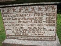 CEMSearch: Name: Frank Birdsall; Born: 1838-01-06; Died: 1914-12-24; Buried: St. Michael's Anglican Cemetery, Conc 2, Lot 11, Westwood, Asphodel Twp; Other names: A. Emma Birdsall (1828-1919), Charlotte L. Everett (1816-1860), Elizabeth Burnham (1802-1827), Ethel W. S. Kent (1896-1973), Francis Everett Birdsall (1883-1966), Margaret A. Birdsall (1826-1850), Maria Huycke (Birdsall)(1843-1918), Mary C. Butterfield ( -1938), Richard Birdsall (1799-1852), Richard Everett Birdsall (1850-1945.)6,7
