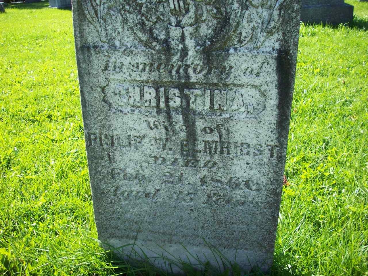 CEMSearch: Name: Christina Elmhirst; Born: - ; Died: 1861-02-02; Age: 27y; Notes: Wife of Philip W. Elmhirst; Buried: Westwood Community Cemetery, Asphodel Twp; No other names. per GEDCOM of Syd Hughes, Aug 6, 2008.1,3,4