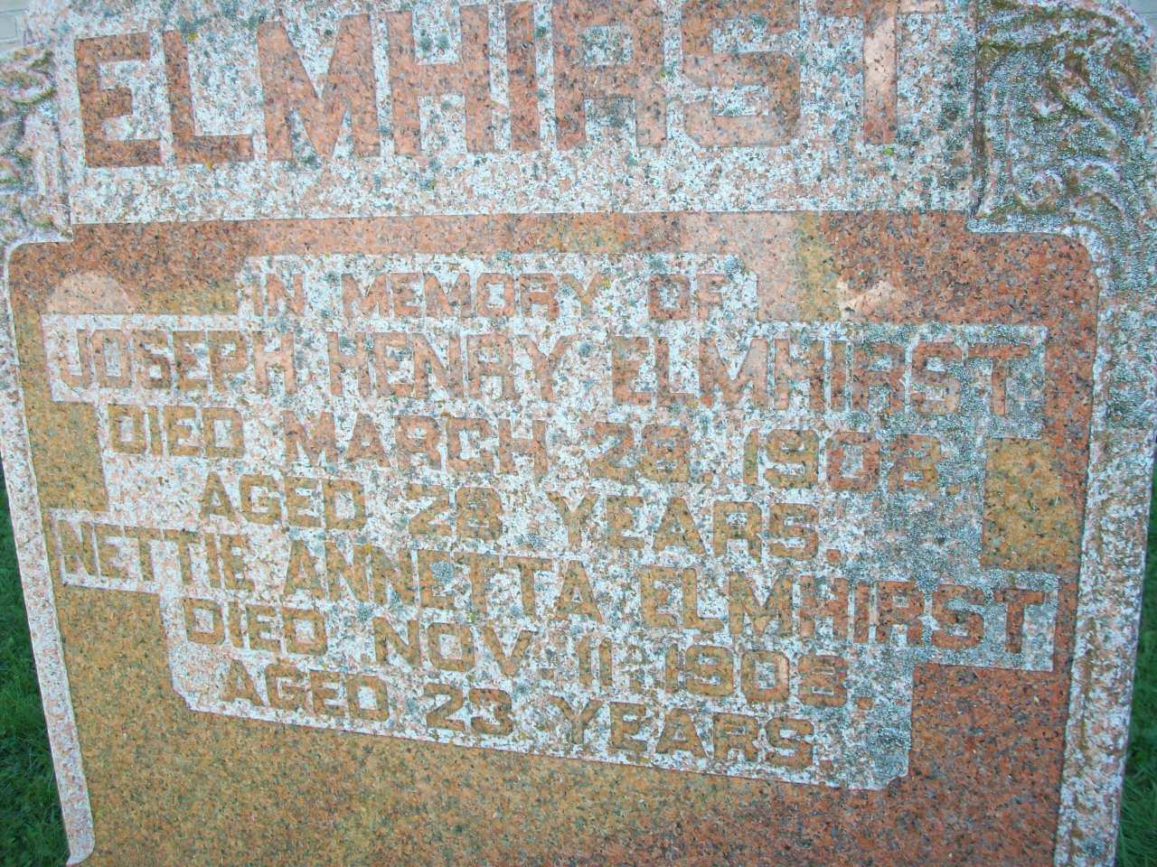 CEMSearch: Name: Nettie Annetta Elmhirst; Born: - ; Died: 1908-11-11; Age :23y; Buried: Westwood Community Cemetery, Asphodel Twp; Other names: Henry Elmhirst ( -1930), Joseph Henry Elmhirst ( -1908), Rachel Elmhirst (McConnell) ( -1918.)6,3
