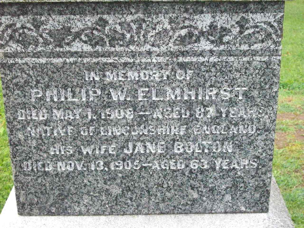 CEMSerch: Name: Jane Elmhirst; Maiden: Bolton; Born: - ; Died: 1905-11-13; Age: 63y; Notes: Wife Philip W. Elmhirst; Buried: Westwood Community Cemetery, Asphodel Twp., Conc 2, Lot 11; Other names: Philip W. Elmhirst ( -1908) per GEDCOM of Syd Hughes, Aug 6, 2008.1,5,4