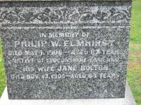 CEMSerch: Name: Philip W. Elmhirst; Born: - ; Died: 1908-05-01; Age: 87y; Notes: Husband of Jane (Bolton) - Native Lincolnshire, England; Buried: Westwood Community Cemetery, Asphodel Twp., Conc 2, Lot 11; Other names: Jane Elmhirst (Bolton)( -1905) per GEDCOM of Syd Hughes, Aug 6, 2008.1,7,8