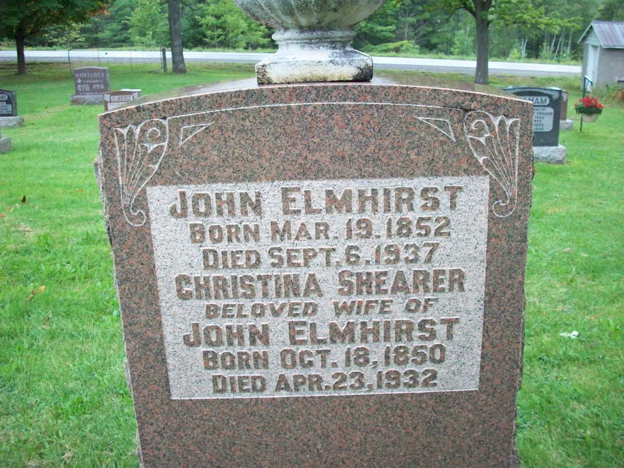 John Elmhirst was born on 19 March 1852 at Otonabee Twp., Peterborough Co., Ontario; Date Mar 19 1852 per Memorial & CEMsearch. Date Mar 1852 & location Ont. per 1911 Census. Date Mar 19 18523 & location Ont. rural per 1901 Census. Date 1852 & location Ont. per 1891 Census. Date 1853 & location Ont. per 1881 Census. Date 1853 & location Ont. per 1871 Census. Date 1853 & location UC per 1861 Census. Date Mar 19 1852 & location Peterborough Co. per IGI Record.1,2,3,4,5,6,7,8,9 He appeared on the census of April 1861 at Otonabee Twp., Peterborough Co., Ontario; Age 8 at 1861 Census: see Richard Elmhirst.8 He appeared on the census of April 1871 at Otonabee Twp., Peterborough Co., Ontario; Age 18 at 1871 Census: see Richard Elmhirst (brother.)9 He lived on 25 January 1874 at Ontario; Witness at marriage of his sister Marian Elmhirst.10 He lived in 1881 at Otonabee Twp., Peterborough Co., Ontario; "John Elmhirst, of Otonabee Township, is the son of Richard Elmhirst, decased. He was born in this township in 1852. He has lived on the homestead all his life. He received by heirship a portion of the old place, consisting of 100 acres, to which he has since added another 100 acres. He was married, in 1881, to Christina Shearer, daughter of Gavin Shearer, of this township." from pg. 631 of “History of the County of Peterborough, Ontario”, published in Toronto in 1884 – in the section “Otonabee Township”.11 He appeared on the census of April 1881 at Otonabee Twp., Ontario; Age 28 at 1881 Census: see Philip Elmhirst (uncle.)2 He lived on 22 February 1882 at Otonabee Twp., Peterborough Co., Ontario; Witness at marriage of James Elmhirst - his brother.10 He married Christina Shearer, daughter of Gavin Shearer and Janet Gilchrist, on 15 March 1882 at Peterborough, Peterborough Co., Ontario; Marriage Reg'n.#009587: Groom: John Elmhirst; Age: 29; Res. & Born: Otonabee Twp; Status: bachelor; Occ.: farmer; Parents: Richard Elmhirst & Margaret Steele; Bride: Christine Sheerer; Age: 29; Res. & Born: Otonabee Twp; Status: spinster; Parents: Gavin Sheerer & Janet Gilchrist; Wit.: W. F. Reynolds & E. Murray; Date: Mar 15 1882; Place: Peterborough; Rel.: Episc. & Pres; Performed by: Rev. E. F. Turrence? (Ontario Marriage Registration, #009587-1882, ancestry.com.)12 John Elmhirst lived on 26 October 1888 at Otonabee Twp., Peterborough Co., Ontario; Witness at marriage of Arthur Elmhirst & Isabella Hope.10 He lived on 2 June 1890 at Anstruther Twp., Apsley, Peterborough Co., Ontario; Witness at marriage of Margaret Elmhirst & John Charles Webster.10 He appeared on the census of April 1891 at Otonabee Twp., Peterborough Co., Ontario; Age 39 at 1891 Census: Elmhirst, John, 39, b. Ont., p.b. Eng. & Scot., EC, farmer, married; Christina, 40, b. Ont., p.b. Scot., EC, married; Jannet, 8, b. Ont., p.b. Ont; Mary, 5; Albert, 2 (1891 Census Online: Otonabee Twp., dist. 109, sub-dist. p, pg. 45, line 17.)3 He appeared on the census of April 1901 at Otonabee Twp., Peterborough Co., Ontario; Age 49 at 1901 Census: Elmhirst, John, 49, b. Ont. r. Mar 19 1852, Eng., Meth., farmer, married; Christina, 50, b. Ont. r. Oct 18 1851, Scot., Meth., married; Jennet E., 18, b. Ont. r. Jun 6 1883, Eng; Mary C., 15, b. Ont. r. Sep 4 1886; Albert S., 12, b. Ont. r. Sep 4 1889 (1901 Census Online: Otonabee Twp., dist. 106, sub-dist. u-2, pg. 3, line 46, T-6491 - Conc 2, Lot 23.)4 He lived in April 1901 at Conc 2 Lot 23, Otonabee Twp., Peterborough Co., Ontario; Residence per 1901 Census: Conc 2, Lot 23, Otonabee Twp.4 He appeared on the census of April 1911 at Otonabee Twp., Peterborough Co., Ontario; Age 59 at 1911 Census: Elmhirst, John, 59, b. Ont. Mar 1852, Eng., Batp., farmer, married; Christina, 60, b. Ont. Nov 1851, Eng., Bapt., married; Mary, 24, b. Ont. Jun 1885, daughter; Albert, 21, b. Ont. Sep 1890, son (1911 Census Online: Otonabee Twp., dist. 112, sub-dist. 2, pg. 6 of 11, line 36 - Conc 2, Lot 23.)5 He lived in April 1911 at Conc 2 Lot 23, Otonabee Twp., Peterborough Co., Ontario; Residence per 1911 Census: Conc 2, Lot 23, Otonabee Twp.5 He died on 6 September 1937 at Ontario at age 85; Date Sep 6 1937 per Memorial. Date 1937 per IGI record.1,6,7 He was buried on 8 September 1937 at Westwood Community Cemetery, Asphodel Twp., Westwood, Peterborough Co., Ontario; CEMsearch: (See Exhibit) John Elmhirst; Born Mar. 19, 1852; Died Sep. 6, 1937; Christina Shearer; Beloved Wife of; John Elmhirst; Born Oct. 18, 1850; Died Apr. 23, 1932 (Westwood Community Cemetery, Westwood, Sep 2 2008.)6