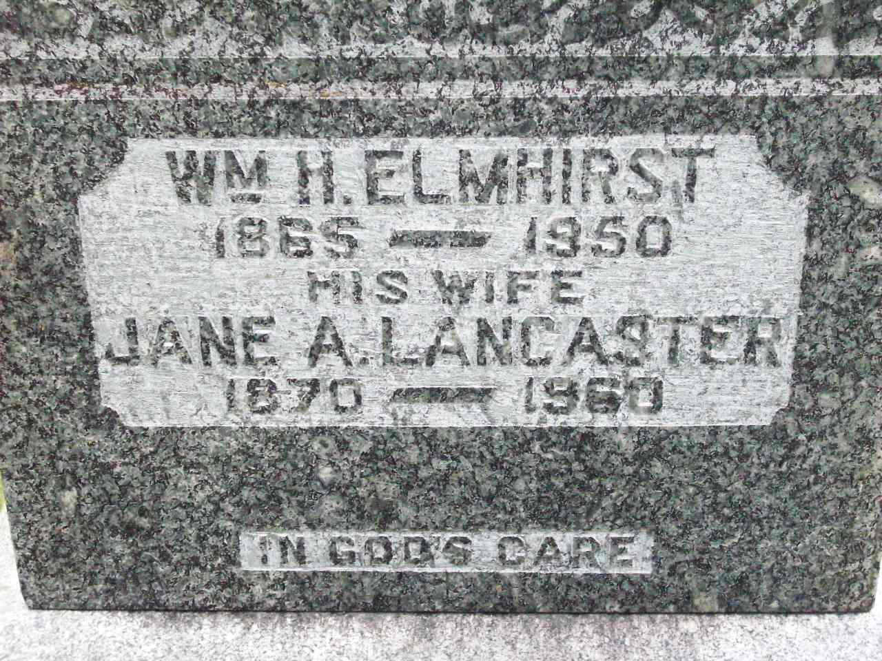 per Death Reg'n. of son Philip Henry Elmhirst.5,6 William H. Elmhirst appeared on the census of April 1911 at Otonabee Twp., Peterborough Co., Ontario; Age 46 at 1911 Census: Elmhirst, William, 46, b. Ont. Jan 1865, Eng., Pres., farmer, married; Jenny, 40, b. Ont. Oct 1871, Eng., Pres., married; Henry, 7, b. Ont. Sep 1904, son; Catherine, 6, b. Ont. Mar 1905, daughter; Albert, 4, b. Ont. Dec 1907, son (1911 Census Online: Otonabee Twp., dist. 112, sub-dist. 2, pg. 6 of 11, line 46 - Conc 9, Lot 22.)7 He lived on 21 May 1932 at R. R. #1, Indian River, Otonabee Twp., Peterborough Co., Ontario; Informant for Death Reg'n. of his son Philip Henry Elmhirst.5 He was buried in 1950 at Westwood Community Cemetery, Asphodel Twp., Westwood, Peterborough Co., Ontario; Memorial: (See Exhibit) Wm. H. Elmhirst; 1865 - 1950; His Wife; Jane A. Lancaster; 1870 - 1960 (Westwood Community Cemetery, Asphodel Twp., Sep 2 2008.)4 He died in 1950 at Ontario; Date 1950 per Memorial. Date 1950 per IGI Record.8,4