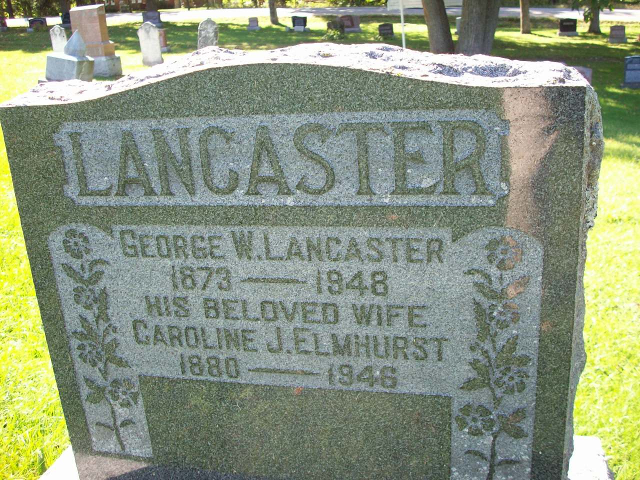 George W. Lancaster was born in 1873 at Ontario; Date 1873 per Memorial. Date 1872 & location Ont. per marr. reg'n.1,2 He lived on 6 October 1901 at Asphodel Twp., Peterborough Co., Ontario; Residence Asphodel Twp. per marr. reg'n.1 He married Caroline Jane "Carrie" Elmhirst, daughter of Henry Elmhirst and Rachel McConnell, on 6 October 1901 at Asphodel Twp., Peterborough Co., Ontario; Marriage Reg'n.##014071: Groom: Geo. W. Lancaster; Age: 29; Res.: Asphodel Twp; Born: Ont; Status: bachelor; Occ.: farmer; Parents: James Lancaster & Annie Town?; Bride: Corie Jane Elmhirst; Age: 23; Res.: Otonabee Twp; Born: Ont; Status: spinster; Parents: Henry Elmhirst & Rachel McConnell; Wit.: M. C. Evans, Keene & Jennie S. Elmhirst, Westwoodl DatE: Jan 30 1901; Place: St. Michael's Church, Westwood; Rel.: CE; Performed by: Rev. W. McLennan; Reg'd.: Oct 6 1901; Reg'd.: John Brackenridge (Ontario Marriage Registration, #014071-1901, ancestry.com.)3 George W. Lancaster was buried in 1948 at Westwood Cemetery, Otonabee Twp., Westwood, Peterborough Co., Ontario; Memorial: (See Exhibit) LANCASTER; George W. Lancaster; 1873 - 1948; His Beloved Wife; Caroline J. Elmhirst; 1880 - 1946 (Westwood Cemetery, Otonabee Twp., Sep 7 2008.)2 He died in 1948 at Ontario; Date 1948 per Memorial.2
