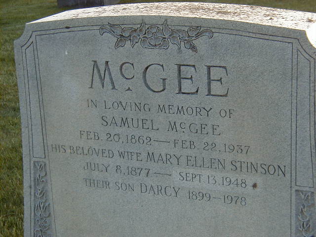 Samuel McGee was born on 20 February 1862 at Asphodel Twp., Peterborough Co., Ontario; Date Feb 20 1862 per Memorial. Date Feb 20 1862 & location Ont. per Death Reg'n. Date 1863 & location Ont. per 1891 Census. Date 1862 & location Ont. per 1881 Census. Date 1862 & location Ont. per 1871 Census. per marriage reg'n. of daughter Laura Irene (McGee) Elmhirst.1,2,3,4,5,6 He appeared on the census of April 1871 at Asphodel Twp., Peterborough East Co., Ontario; Age 9 at 1871 Census: see Andrew McGee.4 He appeared on the census of April 1881 at Asphodel Twp., Peterborough East Co., Ontario; Age 19 at 1881 Census: see Andrew McGee.2 He appeared on the census of April 1891 at Asphodel Twp., Peterborough East Co., Ontario; Age 28 at 1891 Census: see Andrew McGee.3 He married Mary Ellen Stinson circa 1897 at Ontario; Not married per 1891 Census. per marriage reg'n. of daughter Laura Irene (McGee) Elmhirst.1,3 Samuel McGee died on 22 February 1937 at Asphodel Twp., Peterborough Co., Ontario, at age 75; Death Reg'n.#029646: Name: Samuel McGee; Date: Feb 22 1937; Age: 75y 2m 1d; Res.: Asphodel Twp; Born: Ont., Feb 20 1862; Status: married; Occ.: farmer; Wife: Mary Stinson; Parents: Andrew McGee & Margaret Stevenson, b. Ireland; Inf.: Mrs. Samuel McGee, RR#1, Norwood, wife; Cause: dropped dead; Phys.: N. F. Sutton, Norwood; Burial: Norwood Cemetery, Feb 24 1937; Und.: R. K. Tedford, Norwood; Reg'd.: Feb 23 1937; Reg'r.: J. J. ?Kennedy? (Ontario Death Registration, #029646-1937, ancestry.com) Date Feb 22 1937 per Memorial.7,6 He was buried on 24 February 1937 at Norwood/Asphodel Cemetery, Norwood, Peterborough Co., Ontario; Memorial: (see Exhibit) McGee; Samuel McGee; Feb. 20, 1862 - Feb. 22, 1937; His Beloved Wife Mary Ellen Stinson; July 8, 1866 - Sep 13, 1948; Their Son Darcy 1899 - 1978 (Norwood/Asphodel Cemetery, Norwood, Jun 3 2005) Per Death Reg'n.5,6