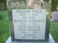Marion Elmhirst was born in 1872 at Otonabee Twp., Peterborough Co., Ontario; Date 1872 & location Ont. per 1881 Census.1 She appeared on the census of April 1881 at Otonabee Twp., Peterborough Co., Ontario; Age 9 at 1881 Census: see Richard Elmhirst.1 As of 24 December 1890,her married name was Borland.2 She married William Hugh Borland, son of John S. Borland and Annie Richmond, on 24 December 1890 at Otonabee Twp., Peterborough Co., Ontario; Marriage Reg'n.#009996: Groom: Wm. Hugh Borland; Age: 25; Res.: Otonabee Twp; Born: Asphodel Twp; Status: bachelor; Occ.: farmer; Parents: John S. & Annie Borland; Bride: Marion Elmhirst; Age: 18; Res. & Born: Otonabee Twp; Status: spinster; Parents: Richard & Ellen Elmhirst; Wit.: John Brackenridge & Maggie Shearer; Date: Dec 24 1890; Place: Otonabee Twp; Rel.: Meth; Performed by: Rev. James McFarlane; Reg'r.: J. M. Drummond (Ontario Marriage Registration, #009966-1890, ancestry.com.)3 Marion Elmhirst was buried in 1954 at Fife's Cemetery, Otonabee Twp., Peterborough Co., Ontario; Memorial: (See Exhibit) BORLAND; William Hugh; 1865 - 1947; His Wife; Marion Elmhirst; 1872 - 1954; Their Children; Olive Marion; 1894 - 1902; Arthur; 1902 - 1917 (Fife's Cemetery, Otonabee Twp., Sep 2008.)4 She died in 1954 at Ontario; Date 1954 per Memorial.4