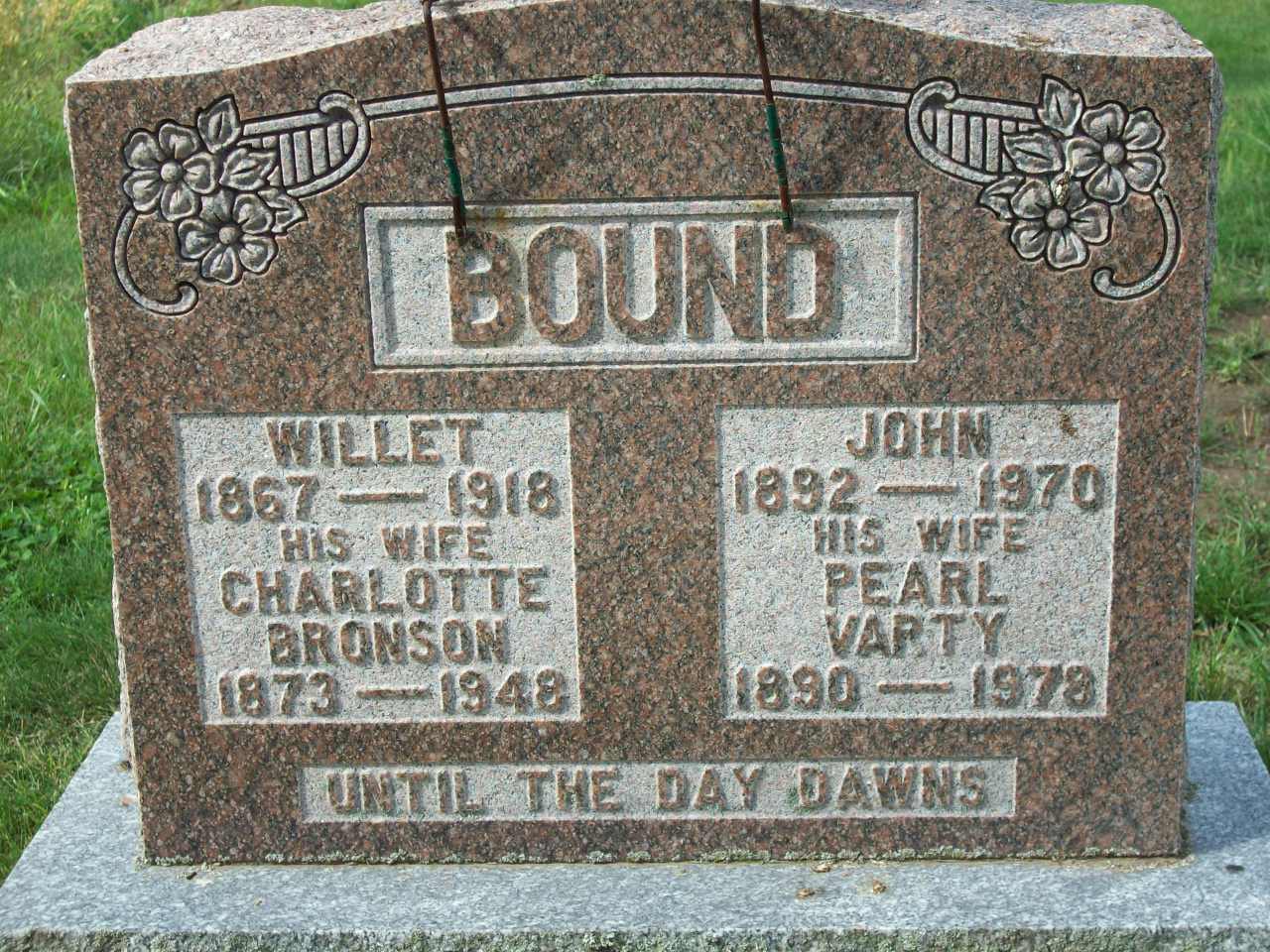 Willet Bound was born on 17 June 1867 at Percy Twp., Northumberland Co., Canada West; Date 1867 per Memorial. Date Jul 1867 & location Ont. per 1911 Census. Date Jul 17 1866 & location Ont. rural per 1901 Census. Date 1886 & location Ont. per 1871 Census. Date Jun 17 1866 & location Percy Twp. per GEDCOM of Cheryl Kemp Taber, Sep 20, 2008. Date 1866 & location Brighton per marr. reg'n.1,2,3,4,5,6 He appeared on the census of April 1871 at Cramahe Twp., Northumberland Co., Ontario; Age 5 at 1871 Census: see John Carl (grandfather.)3 He lived on 26 September 1891 at Methuen Twp., Peterborough Co., Ontario; Residence Methuen Twp. per marr. reg'n.2 He married Charlotte May "Lottie" Bronson, daughter of Harrison W. Brunson and Mabel Esther Brickman, on 26 September 1891 at Norwood, Peterborough Co., Ontario; Marriage Reg'n.#007711: Groom: Willet Bound; Age: 25; Res.: Methuen; Born: Brighton; Status: bachelor; Occ.: farmer; Parents: John Bound & Charlotte Hubble; Bride: Charlotte Brunson; Age: 18; Res.: Burleigh; Born: Percy; Status: spinster; Parents: Harrison Bunson & Mary Brickman; Wit.: W. A. F. Buchanan & Lizzie Powell, Norwood; Date: Sep 26 1891; Place: Norwood; Rel.: Meth; Performed by: Rev. W. Buchanan; Reg'r.: Jas. Calder (Ontario Marriage Registration, #007711-1891, ancestry.com)