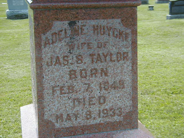 Adeline Amanda Huycke was born on 7 February 1849 at Prince Edward Co., Canada West; Date Feb 7 1849 & location Ont. per Death Reg'n & Memorial. Date May 26 1850 & location Ont. rural per 1901 Census. Date 1849 & location Ont. per 1891 Census. Date 1850 & location Ont. per 1881 Census. Date 1850 & location Cda. per 1861 Census. Date 1848 & location Cda. per 1851 Census. Date 1851 & location Cda. per marr. reg'n.1,4,5,6,2,7,3,8 She appeared on the census of 1852 at Hillier Twp., Prince Edward Co., Canada West; Age 3 at 1851 Census: see Platt Huycke.7 She appeared on the census of April 1861 at Hillier Twp., Prince Edward Co., Canada West; Age 11 at 1861 Census: see Platt Huycek.8 She lived on 3 April 1878 at Hillier Twp., Prince Edward Co., Ontario; Residence Hillier Twp. per marr. reg'n.1 As of 3 April 1878,her married name was Taylor.1 She married James Samuel Taylor, son of William Taylor and Abigail Ann Carscallen, on 3 April 1878 at Hillier Twp., Wellington, Prince Edward Co; Marriage Reg'n.#009422: Groom: James Samuel Taylor; Age: 30; Res.: Hillier Twp; Born: Cda; Status: widower; Occ.: farmer; Parents: William & Ann Taylor; Bride: Adeline Huyck; Age: 27; Res.: Hillier Twp; born: Cda; Status: spinster; Parents: Platt & Hannah Huyck; Wit.: Martha S. Hanson, Wellington; Date: Apr 3 1878; Place: Wellington; Rel.: Meth; Performed by: Rev. Chas. A. Hanson; Reg'r.: John H. Osborne (Ontario Marriage Registration, #009422-1878, ancestry.com.)9 Adeline Amanda Huycke appeared on the census of April 1881 at Hillier Twp., Prince Edward Co., Ontario; Age 31 at 1881 Census: see James S. Taylor.6 She appeared on the census of April 1891 at Hillier Twp., Prince Edward Co., Ontario; Age 42 at 1891 Census: see James Taylor.5 She appeared on the census of April 1901 at Hillier Twp., Prince Edward Co., Ontario; Age 50 at 1901 Census: see James Taylor.4 She died on 8 May 1933 at Hillier Twp., Rose Hall, Prince Edward Co., Ontario, at age 84; Death Reg'n.#028620: Name: Adeline Amanda Taylor; Date: May 8 1933; Age: 84y 3m 1d; Res.: Rose Hall, Hillier Twp; Born: Feb 7 1849, Ont; Status: widow; Parents: Platt Huycke & Hannah Osterhout, b. Ont; Inf.: Alex Monahan, Wellington, nephew; Burial: Brighton, May 11 1933; Reg'd.: May 9 1933; Reg'r.: Percy Osborne (Ontario Death Registration, #028620-1933, ancestry.com.)10 She was buried on 11 May 1933 at Mount Hope Cemetery, Brighton, Northumberland Co., Ontario; Memorial: (See Exhibit) Adeline Huycke; Wife of; Jas. S. Taylor; Born; Feb. 7, 1849; Died; May 8, 1933 (Mount Hope Cemetery, Jul 10 2004) Date May 11 1933 per Death Reg'n.2,3