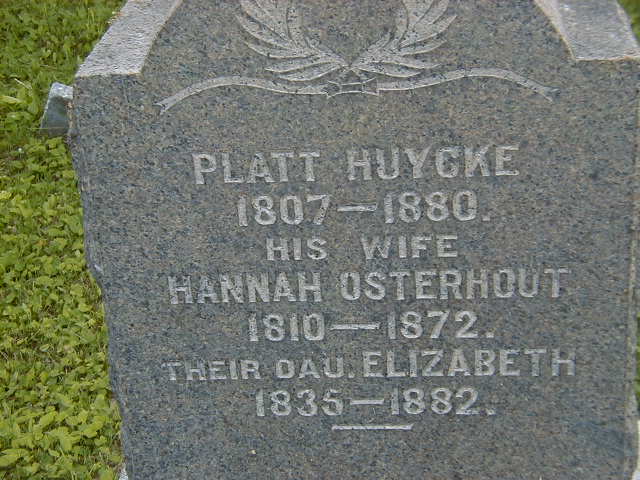 Platt Huycke was born in 1807 at Upper Canada; Date 1807 per Memorial. Date 1810 & location USA per 1861 Census. Date 1806 & location Cda. per 1851 Census. Date 1807 per IGI Record. Date 1807 & location Cda. per GEDCOM of Richard Lander, Sep 20, 2008. per marriage reg'n. of daughter Adaline (Huyck) Taylor.1,4,5,6,7,2 He married Hannah Osterhout before 1833 at Upper Canada; per GEDCOM of Richard Lander, Sep 20, 2008.per marriage reg'n. of daughter Adaline (Huyck) Taylor.1,4 Platt Huycke appeared on the census of 1852 at Hillier Twp., Prince Edward Co., Canada West; Age 45 at 1851 Census: Huycke, Platt, 45, b. Cda., WM, lab., married; Hannah, 44, b. Cda., WM, married; Sarah J., 17; Elizabeth, 13; Catherine, 13; Phebe Ann, 7; Adeline, 3 (1851 Census: Hillier Twp. - pg. 96 of 122 per ancestry.com - pg. 48 of printed census.)6 He appeared on the census of April 1861 at Hillier Twp., Prince Edward Co., Canada West; Age 51 at 1861 Census: Huyck, Platt, 51, b. USA, WM, fisherman, married; Hannah, 50, b. USA, WM, married; Elizabeth, 25, b. Cda; Phebe Ann, 14, b. Cda; Adaline A., 11; ?Alsworth?, Arthur, 26, b. Cda., Friends, Blacksmith, widower (1861 Census: Hillier Twp., pg. 26, line 45.)7 He lived in April 1861 at Conc 1 Lot 18, Hillier Twp., Prince Edward Co., Canada West; Residence per 1861 Census: Conc 1, Lot 18, Hillier Twp. - title at tope of page is "Lakeshore Ward".7 He died in 1880 at Hillier Twp., Prince Edward Co., Ontario; Date 1880 per Memorial. Date 1880 & location Hillier Twp. per IGI Record & per GEDCOM of Richard Lander, Sep 20, 2008.4,5,2 He was buried in 1880 at Chadsey Cemetery, Hillier Twp., Prince Edward Co., Ontario; Memorial: (See Exhibit) Platt Huycke; 1807 - 1880; His Wife; Hannah Osterhout; 1810 - 1872; Their Dau Elizabeth; 1835 - 1882 (Chadsey Cemetery, Hillier Twp.) per IGI Record. per GEDCOM of Richard Lander, Sep 20, 2008.4,5,2