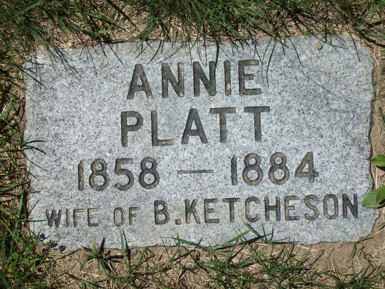 CEMSearch: Name: Annie Ketcheson; Maiden: Platt; Born: 1858; Died: 1884; Age: - ; ID: WRKWTHDP11; Other names: Ketcheson, Florence Matilda (1884-1884), Platt, Charles Benjamin (1854-1923), Platt, Frederick M. (1895-1981), Platt, George Leslie (1924-2009), Platt, Lillian May [Davison] (1928-2013), Platt, Lillian Ruth [Campbell] ( -2009), Platt, Lucy [Cumming] (1824-1899), Platt, Maitland (1819-1894), Platt, Mary (1856-1893), Platt, Olive E. [Evans] (1891-1973); Cemetery: Warkworth Cemetery, Conc 3, Lot 15, Percy Twp., Village of Warkworth, Northumberland Co., Sec 2 Row 23 Plot 08; Note: Born Percy Twp. Daughter of Maitland Platt and Lucy Cummings. Married Nov. 6, 1878 at Percy Twp. to Benjamin Clarke Ketcheson. Mother of Florence Matilda. Sister of James Maitland (Annie Pettey), Jane A., Charles Benjamin (Emma Wells), Mary, Florence (Andrew) Thompson and Prudence. Info from birth, death and marriage reg's. On Apr. 17, 1889 Benjamin married Alferetta Gould. (https://www.cemsearch.ca/burial/?pID=WRKWTHDP11%5E2.)5,6