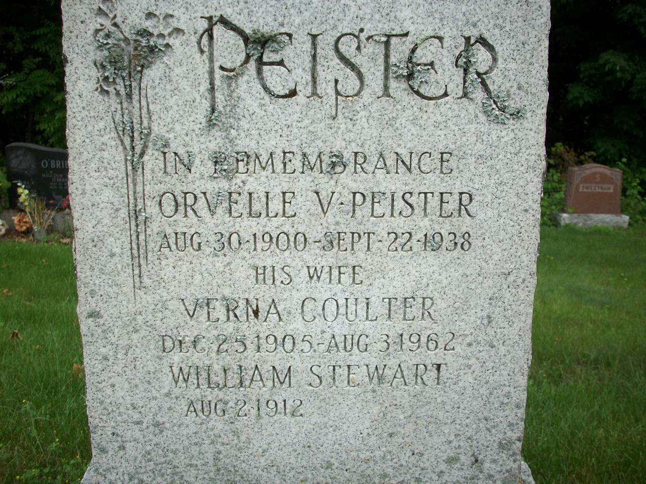 Verna Evelyn Coulter was born on 25 December 1905 at Conc 1, Murray Twp., Northumberland Co., Ontario; Birth Reg'n.#050721: Name: Verna Evelyn Coulter; Date: Dec 25 1905; Parents: George Lewis Coulter & Maggie McDonald; Occ.: farmer, Conc 1, Murray Twp; Inf. & Phys.: Dr. R. J. Wade, Brighton; Reg'd.: Jan 18 1906 (Ontario Birth Registration, #050721-1906, ancestry.com) Date Dec 25 1905 per Memorial.2,3 She married Orvelle Vansicklen Peister, son of Burten Henry Peister and Adolpha Anna Denison, on 6 May 1924 at Methodist Parsonage, Cobourg, Northumberland Co., Ontario; Marriage Reg'n.#015511: Groom: Orvelle Vansicklen Peister; Age: 23; Res. & Born: Brighton Twp; Status: bachelor; Occ.: farmer; Rel.: Meth; Parents: Burton Peister, b. Brighton Twp. & Adolpha Denison; Bride: Verna Coulter; Age: 18; Res. & Born: Brighton Twp; Status: spinster; Rel.: Meth; Parents: George L. Coulter, b. Murray Twp. & Maggie McDonald; Expected Res.: Cobourg; Wit.: Geo. Goddard, Cobourg & Florence Stillman, Cobourg; Date: May 6 1924; Place: Methodist Parsonage, Cobourg; Performed by: R. F. Stillman, Cobourg, Meth; Sworn: Cobourg, May 3 1924; Reg'r.: P. O'Rourke (Ontario Marriage Registration, #015511-1924, ancestry.com.)4 As of 6 May 1924,her married name was Peister.4 Verna Evelyn Coulter lived on 22 September 1938 at 16 Peterborough Ave., Toronto, York Co., Ontario; Informant for Death Reg'n. of her husband Orvelle V. Peister.5 She died on 3 August 1962 at Ontario at age 56; Date Aug 3 1962 per Memorial.3 She was buried on 5 September 1962 at Greenwood Cemetery, Smithfield, Northumberland Co., Ontario; Memorial: (See Exhibit) PEISTER; In Remembrance of; Orvelle V. Peister; Aug. 30, 1900 - Sept 22, 1938; His Wife; Verna Coulter; Dec. 25, 1905 - Aug. 3, 1962; William Stewart; Aug 2 1912 - (Greenwood Cemetery, Smithfield, July 1, 2013.)3