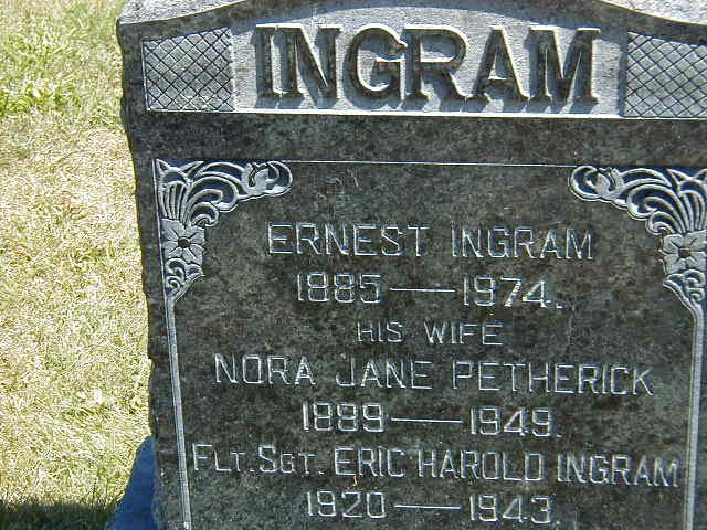 Note: Amelia????3 He appeared on the census of April 1901 at Seymour Twp., Northumberland Co., Ontario; Age 16 at 1901 Census: see John Ingram.1 He married Nora Jane Petherick, daughter of Thomas James Petherick and Margaret A. "Maggie" McKenzie, on 24 November 1909 at Zion Methodist Church, Seymour Twp., Campbellford, Northumberland Co., Ontario; Marriage Reg'n.#015412: Groom: Ernest Ingram; Age: 24; res.: Seymour; Status: bachelor; Occ.: farmer; Rel.: Pres; Parents: John Ingram, farmer & Maggie Mintie; Bride: Nora Petherick; Age: 20; Res.: Seymour; Status: spinster; Rel.: Meth; Parents: Thos. Petherick, farmer & Maggie McKenzie; Wit.: J. F. Petherick, Seymour & Minnie M. Green, Seymour; Date: Nov 24 1909; Place: Campbellford; Reg'd.: Nov 24 1909 (Ontario Marriage Registration, #015412-1909, ancestry.com) Location Zion Methodest Church per Alexander Ingram GEDCOM file sent to my by Lorraine (Ingram) Wager, Nov 17, 2008.6,4 Ernest Ingram lived on 20 February 1918 at Seymour Twp., Campbellford, Northumberland Co., Ontario; Informant for Death Reg'n. of his father John Ingram.7 He died on 9 October 1974 at Seymour Twp., Northumberland Co., Ontario, at age 89; Date 1974 per Memorial. Date Oct 9 1974 per Alexander Ingram GEDCOM file sent to my by Lorraine (Ingram) Wager, Nov 17, 2008.4,2 He was buried on 11 October 1974 at Burnbrae Cemetery, Seymour Twp., Northumberland Co., Ontario; Memorial: (See Exhibit) INGRAM; Ernest Ingram; 1885 - 1974; His Wife; Nora Jane Petherick; 1889 - 1949; Flt. Sgt. Eric Harold Ingram; 1920 - 1943 (Brunbrae Cemetery, Seymour Twp.)