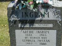 Archibald "Archie" Ingram was born on 4 June 1888 at Seymour Twp., Northumberland Co., Ontario; Date 1888 per Memorial & CEMSearch. Date Jun 4 1887 & location Ont. rural per 1901 Census. Date 1887 & location Ont. per 1891 Census. Date Jun 4 1887 & location Seymour Twp. per Alexander Ingram GEDCOM file sent to my by Lorraine (Ingram) Wager, Nov 17, 2008.1,3,4,5,2 He appeared on the census of April 1891 at Seymour Twp., Northumberland Co., Ontario; Age 4 at 1891 Census: see John Ingram.3 He appeared on the census of April 1901 at Seymour Twp., Northumberland Co., Ontario; Age 13 at 1901 Census: see John Ingram.1 He lived on 1 December 1919 at Campbellford, Northumberland Co., Ontario; Residence Campbellford per marr. reg'n.6 He married Georgina "Gloria" McLean, daughter of George McLean and Tina ?, on 1 December 1919 at Toronto, York Co., Ontario; Marriage Reg'n.#007126?: Groom: Archie Ingram; Age: ? ; Res. & Born: Campbellford; Status: bachelor; Occ.: farmer; Rel.: Pres; Parents: John Ingram & Margaret Mintie; Bride: Georgina McLean; Age: ? ; Born: Toronto; Status: spinster; Rel.: Pres; Parents: George McLean & Tina ? ; Wit.: E. L. Morrow & Hugh J. Morrow; Date: Dec 1 1919; Place: Toronto; Performed by: J. W. Morrow, Toronto; Sworn: Toronto, Dec 1 1919 (Ontario Marriage Registration, #007126-1919, ancestry.com.)7 Archibald "Archie" Ingram died on 3 July 1965 at Seymour Twp., Northumberland Co., Ontario, at age 77; Date July 3 1965 per CEMSearch - says Buried July 7 1965. Date 1965 per Memorial. Date Jul 7 1965 per Alexander Ingram GEDCOM file sent to my by Lorraine (Ingram) Wager, Nov 17, 2008.4,5,2 He was buried on 9 July 1965 at Burnbrae Cemetery, Seymour Twp., Northumberland Co., Ontario; Memorial: (See Exhibit) INGRAM; Archie Ingram; 1888 - 1965; His Beloved Wife; Georgia McLean; 1902 - 1980 (Burnbrae Cemetery, Seymour Twp.)