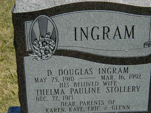 Donald "Douglas Ingram was born on 25 March 1910 at Fermie, Kootenay Dist., British Columbia; Date Mar 25 1910 per Memorial. Date Mar 25 1920 per Alexander Ingram GEDCOM file sent to my by Lorraine (Ingram) Wager, Nov 17, 2008.1,2 He died on 16 March 1992 at Campbellford Memorial Hospital, Campbellford, Northumberland Co., Ontario, at age 81; Date Mar 16 1992 per Memorial. Date Mar 16 1992 per Alexander Ingram GEDCOM file sent to my by Lorraine (Ingram) Wager, Nov 17, 2008.1,2 He was buried on 7 May 1992 at Burnbrae Cemetery, Seymour Twp., Northumberland Co., Ontario; Memorial: (See Exhibit) INGRAM; D. Douglas Ingram; May 25, 1910 - Mar 16, 1992; His Beloved Wife; Thelma Pauline Stollery; Dec 22, 1913 - ; Dear Parents of; Karen, Kaye, Eric & Glenn (Brunbrae Cemetery, Seymour Twp.) Date May 7 1992 per Alexander Ingram GEDCOM file sent to my by Lorraine (Ingram) Wager, Nov 17, 2008.1,2