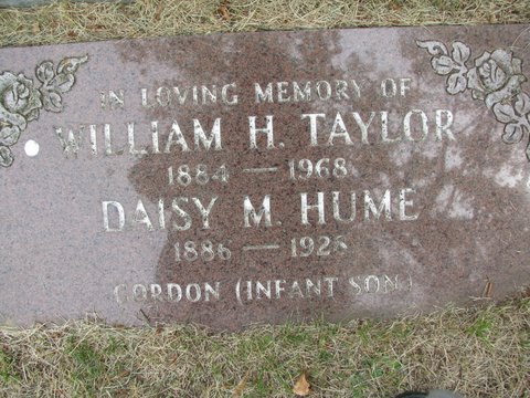 William H. Taylor was born on 9 June 1884 at London, England; per Taylor family info from Jim Belford (provided to him by Freda (Taylor) Pettifer), sent to me in a letter, Nov 22, 2008. Date 1884 per Memorial.1 He married Daisy Marguerite Hulme, daughter of Frederick Hulme and ? ?, circa 1910 at England; per Taylor family info from Jim Belford (provided to him by Freda (Taylor) Pettifer), sent to me in a letter, Nov 22, 2008. William H. Taylor lived on 15 September 1929 at Percy Twp., Warkworth, Northumberland Co., Ontario; Informant for Death Reg'n. of his wife Daisy Margaret (Hulme) Taylor.2 He died on 7 December 1968 at Ontario at age 84; per Taylor family info from Jim Belford (provided to him by Freda (Taylor) Pettifer), sent to me in a letter, Nov 22, 2008. Date 1968 per Memorial.1 He was buried on 10 December 1968 at Warkworth Cemetery, Warkworth, Northumberland Co., Ontario; Memorial: (See Exhibit) In Loving Memory of; William H. Taylor; 1884 - 1968; Daisy M. Hume; 1886 - 1928; Gordon (Infant Son) (Warkworth Cemetery, Shot Aug 8 2009 by Jim Belford & sent to me via email.)1