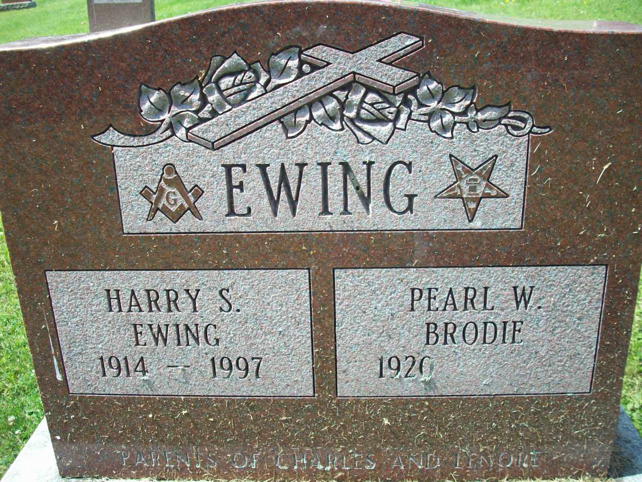 East Northumberland Secondary School is a great school and much of its greatness can be attributed in no small measure to the contributions made by Mr. Harry Ewing." from ECHO, Silver Anniversary Edition, 1980, page 6. in 1980 at East Northumberland Secondary School, Brighton, Northumberland Co., Ontario. He died on 6 February 1997 at Ontario at age 82; Date 1997 per Memorial. Date Feb 1997 per family tree of stableford on ancestry.ca, Jun 27 2023.1,9 He was buried on 9 February 1997 at Warkworth Cemetery, Warkworth, Northumberland Co., Ontario; Memorial: (See Exhibit) EWING; Harry S; Ewing; 1914 - 1997; Pearl W; Brodie; 1920 - ; Parents of Charles and Lenore (Warkworth Cemetery, Warkworth, Jul 12 2009) Date of Death Feb 6 1997 per family tree of stableford on ancestry.ca, Jun 27 2023.1,9
