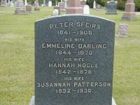 Susannah J. Patterson was born on 9 July 1853 at Percy Twp., Northumberland Co., Canada West; Date Jul 9 1852 & location Ont. rural per 1901 Census. Date 1853 & location Ont. per 1891 Census. Date 1853 & location Ont. per 1871 Census. Date 1853 & location UC per 1861 Census. Date 1853 & location Percy Twp. per marr. reg'n.1,2,4,5,6 She appeared on the census of April 1861 at Percy Twp., Northumberland Co., Canada West; Age 8 at 1861 Census: see James Patterson.1 She appeared on the census of April 1871 at Percy Twp., Northumnberland Co., Ontario; Age 18 at 1871 Census: see James Patterson.2 As of 1 January 1880,her married name was Speirs.4 She married Peter Speirs, son of John Speirs and Mary Miller, on 1 January 1880 at Seymour Twp., Campbellford, Northumberland Co., Ontario; Marriage Reg'n.#007437: Groom: Peter Speirs; Age: 37; Res. & Born: Percy Twp; Status: widower; Occ.: farmer; Parents: John & Mary Speirs; Bride: S. J. Patterson; Age: 27; Res. & Born: Percy Twp; Parents: James & Sarah Patterson; Wit.: C. J. Mather ,Warkworth & J. B. Ewing, Dartford; Date: Jan 1 1880; Place: Campbellford; Rel.: Meth. & Pres; Performed by: G. J. Dingman; Reg'r.: Daniel Kennedy (Ontario Marriage Registration, #007437-1880, ancestry.com.)4 Susannah J. Patterson appeared on the census of April 1891 at Percy Twp., East Northumberland Co., Ontario; Age 38 at 1891 Census: see Peter Speirs.6 She appeared on the census of April 1901 at Percy Twp., Northumberland Co., Ontario; Age 48 at 1901 Census: see Peter Speirs.5 She was buried in 1930 at Warkworth Cemetery, Warkworth, Northumberland Co., Ontario; Memorial: (See Exhibit) Peter Speirs; 1841-1906; His Wife; Emmeline Darling; 1844-1870; His Wife; Hannah Hogle; 1842-1878; His Wife; Susannah Patterson; 1852-1930 (Warkworth Cemetery, Warkworth.)3 She died in 1930 at Percy Twp., Northumberland Co., Ontario; Date 1930 per Memorial.3