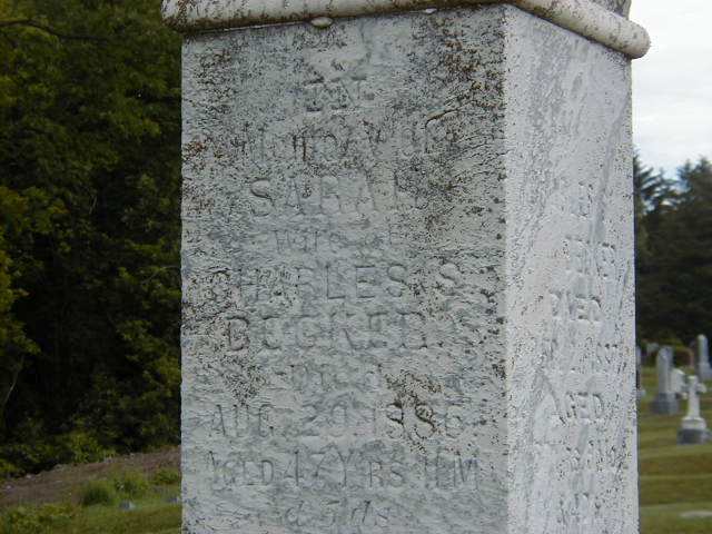 Sarah Irish was born on 24 September 1838 at Cramahe Twp., Northumberland Co., Upper Canada; Date Sep 24 1838 per Memorial - age 47y 11m 5d at death Ag 29 1886. Date 1838 & location Ont. per 1881 Census. Date 1841 & location Ont. per 1871 Census. Date 1837 & location Cda. per 1851 Census. Date Sep 29 1838 & location Cramahe Twp. per GEDCOM of Bonnie, Jan 24 2009. Date 1839 & location Brighton Twp. per marriage register.1,2,3,4,5,6 She appeared on the census of 1852 at Cramahe Twp., Northumberland Co., Canada West; Age 14 at 1851 Census: see Peter Irish.2 As of 8 March 1859,her married name was Becker.1 She lived on 8 March 1859 at Brighton Twp., Northumberland Co., Canada West; Residence Brighton Twp. per marriage register.3 She married Charles Samuel Becker, son of Charles Stanley Becker and Margaret Smith, on 8 March 1859 at Brighton Twp., Northumberland Co., Canada West; Marriage Register: Groom: Charles S. Becker; Age: 29; Res. & Born: Brighton Twp; Parents: Chas. & M. F. Becker; Bride: Sarah Irish; Age: 20; Res. & Born: Brighton Twp; Parents: Peter Irish & ? ; Date: Mar 8 1859; Place: Northumberland Co. (Ontario Marriage Register, anecstry.com) per GEDCOM of Jo Ann Baxley, Jan 25 2009. per GEDCOM of Bonnie, Jan 24 2009.1,3 Sarah Irish appeared on the census of April 1871 at Brighton Twp., Northumberland Co., Ontario; Age 30 at 1871 Census: see Charles S. Becker.4 She appeared on the census of April 1881 at Brighton Twp., Northumberland Co., Ontario; Age 43 at 1881 Census: see Charles S. Becker.5 She died on 29 August 1886 at Northumberland Co., Ontario, at age 47; Date Aug 29 1886 per GEDCOM of Jo Ann Baxley, Jan 25 2009. per GEDCOM of Bonnie, Jan 24 2009.1 She was buried on 31 August 1886 at Brighton Twp., Hilton, Northumberland Co., Ontario; Memorial: (See Exhibit) In; Memory of; Sarah; Wife of; Charles S; Becker; Died; Aug. 29, 1886; Aged 47 Y'rs. 11 M; & 5 D's (Mount Hope Cemetery, Brighton, by Dan, Jun6 2003)